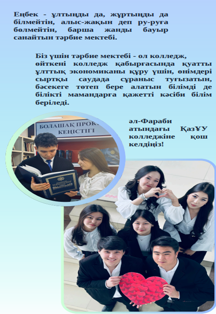 Дорогие абитуриенты, студенты и родители! Добро пожаловать в Колледж КазНУ имени аль-Фараби - место, где профессиональный путь начинается с сильной практической подготовки и понятной траектории развития. Мы работаем в модели «колледж - университет», поэтому обучение у нас выстроено так, чтобы выпускники уверенно входили в профессию и могли продолжить образование в университете. Главная ценность колледжа - наши востребованные специальности, которые дают реальные компетенции для современного рынка труда Казахстана. Мы готовим специалистов по направлениям: Юриспруденция - правовая грамотность, защита прав и работа с документами; Программное обеспечение - разработка цифровых решений и практическое программирование; Учёт и аудит - финансовая дисциплина, прозрачность и стабильность бизнеса; Переводческое дело - языковые навыки и коммуникация для международного сотрудничества. Колледж КазНУ - это выбор тех, кто ценит качество, практику и результат. Мы учим профессии, которые открывают возможности и формируют уверенное будущее.