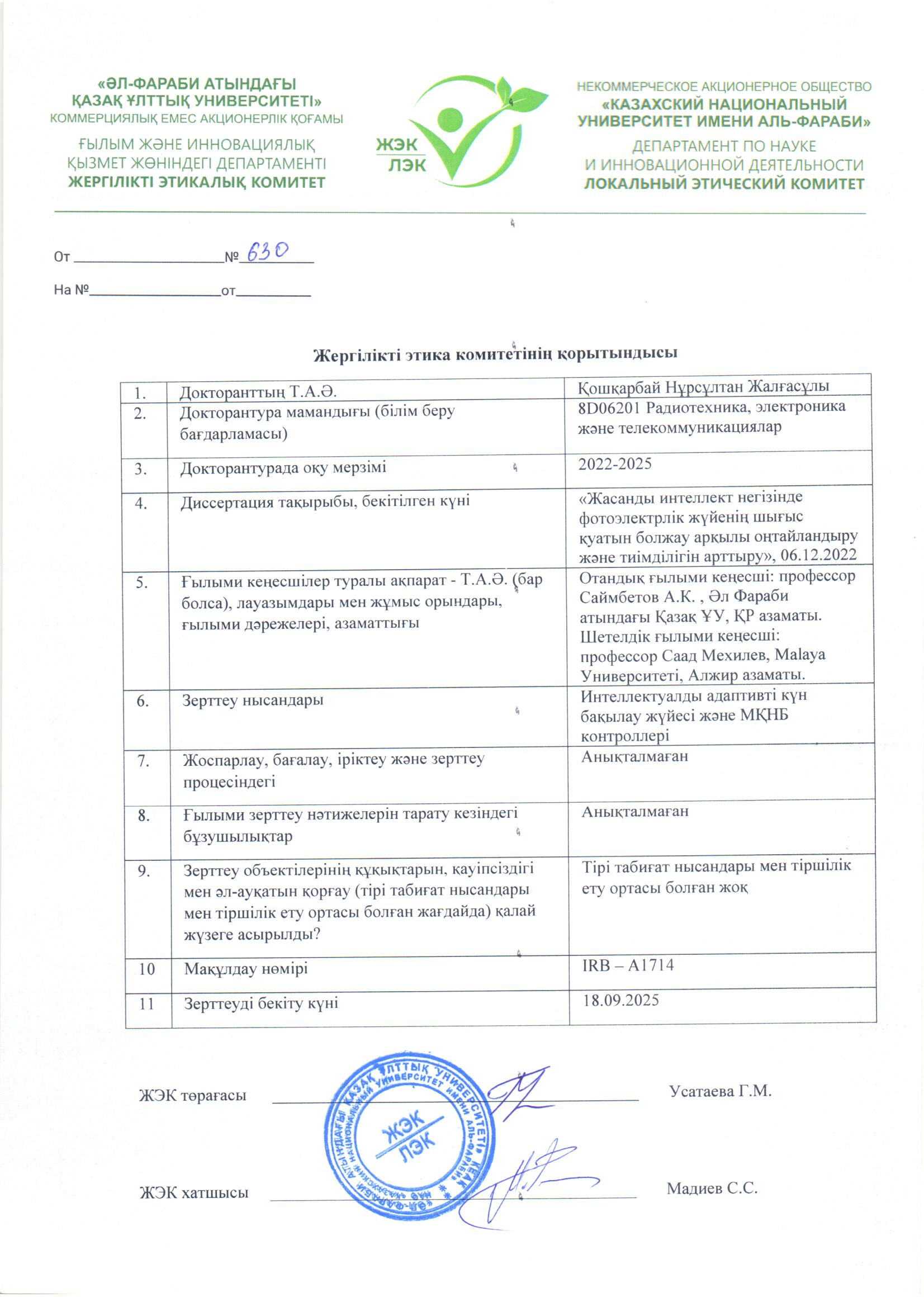 The defense will be held in a hybrid online and offline format on December 23, 2025 at 14:00 p.m. at the Dissertation Council at Al-Farabi Kazakh National University in the group of specialties/educational programs 6D060400 (8D05306) – Physics, 6D072300 (8D05303) – Technical Physics, 6D061100 (8D05307) – Physics and Astronomy, 6D071000 (8D07110) – Materials Science and Technology of New Materials, 6D071700 (8D07106) – Thermal Power Engineering, 8D07108 – Electrical Power Engineering, 8D01501 – Physics, 6D073200, 8D07502 – Standardization and Certification (by industries), 8D05309 – Nuclear Medicine, 6D071900/8D06201-Radio engineering, electronics and telecommunications.