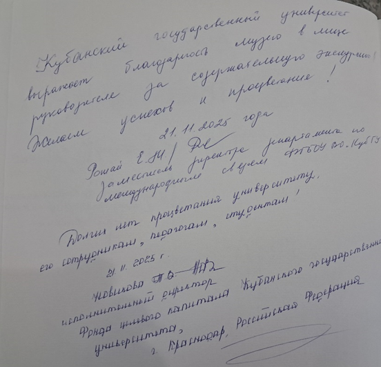 Кубань мемлекеттің университетінің халықаралық байланыстар жөніндегі департамент басшысы Е.М. Рошай мен аталған университеттің мақсатты жинақ қорының директоры Т.В. Новикова ханымдар арнайы университетке келіп, тыныс тілшілігімен танысты.