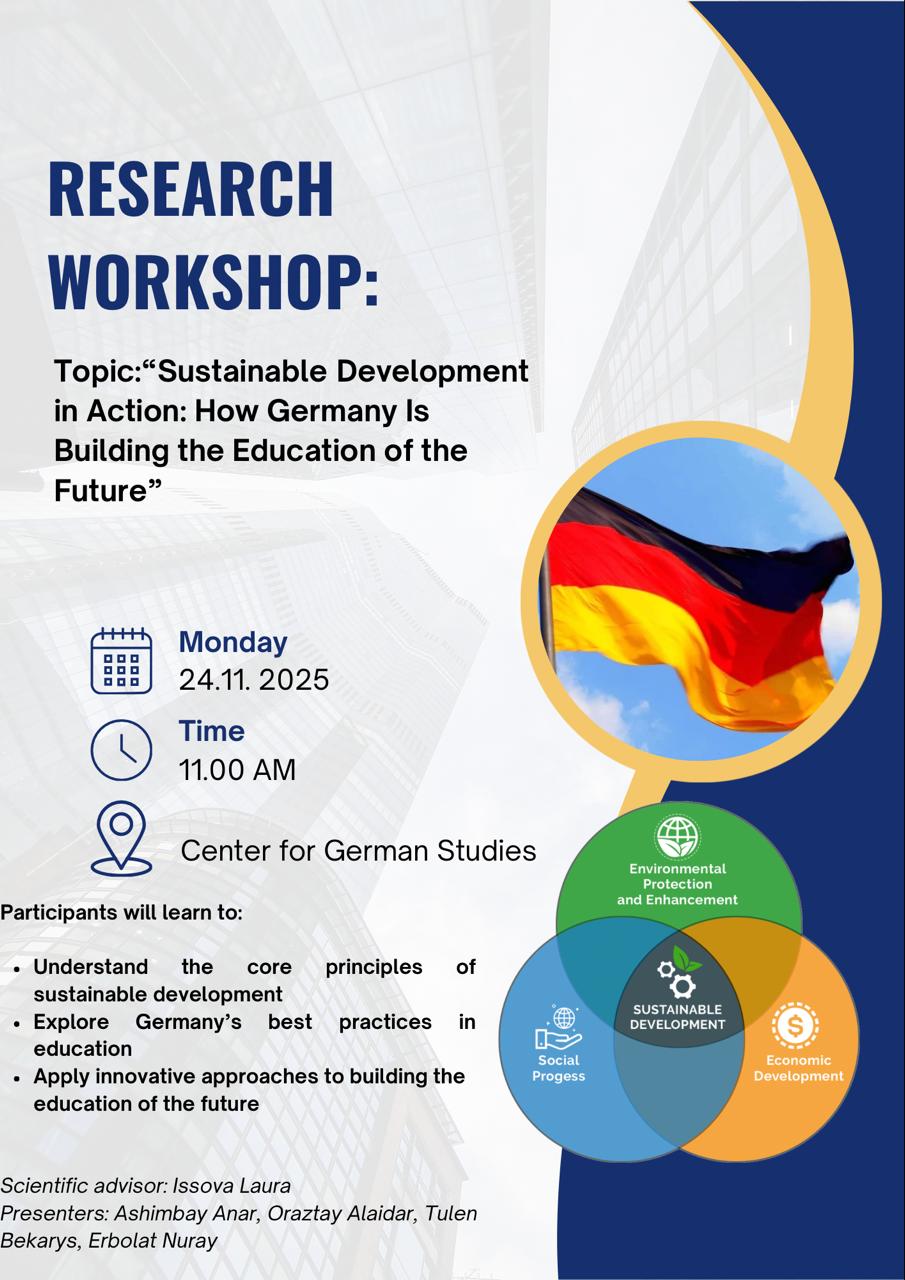 On November 24, 2025, at the Center for German Studies, master’s students of the educational programs Regional Studies and International Relations — Ashimbay Anar, Orazatay Alaidar, Tülen Bekarys, Zhaksybayev Dinmukhamed, and Yerbolat Nurai — who are undergoing a research internship, together with leading scholars L.Issova, G. Baikushikova, and A. Kulbayeva, organized an event titled “Sustainable Development in Action: How Germany Builds the Education of the Future.”