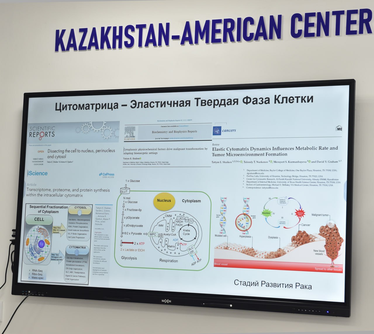 Өз кезегінде профессор Таттым Шайкен цитоматрицаның қасиеттері мен жаңа зерттеу бағыттарына арналған ғылыми презентациясын ұсынды. Ол қатерлі ісік жасушалар мінез-құлқын зерттеудегі цитоматрицаның маңызына тоқталып, алдағы уақытта жүзеге асатын бірлескен жобалардың негізгі бағыттарымен таныстырды. «Қазіргі таңда әлем ғалымдары қатерлі ісік ауруының алдын алу және емдеу бағытында жан-жақты зерттеулер жүргізуде. Біздің басты мақсат та – осы. Біз жасушадағы цитоплазманы зерттеу арқылы клеткадағы қатерлі ісікті болдырмау жолдарын қарастырамыз», – деді Таттым Шайкен.