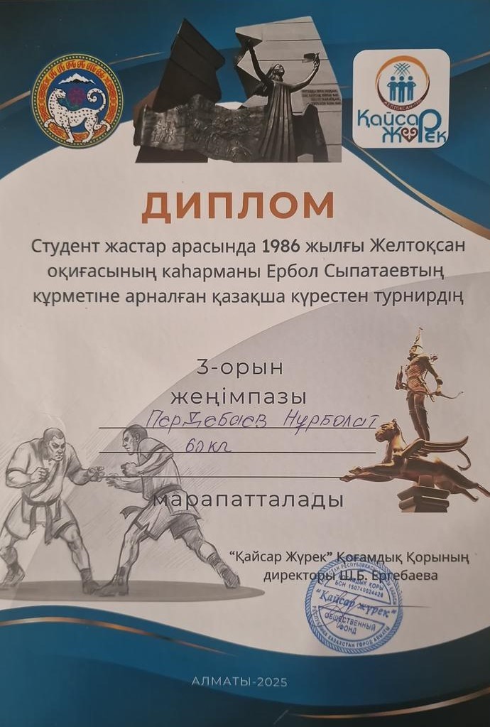 Пердебаев Нұрболат, медицина факультетінің 1 курс студенті, 60 кг салмақ дәрежесінде 3 орын алды.