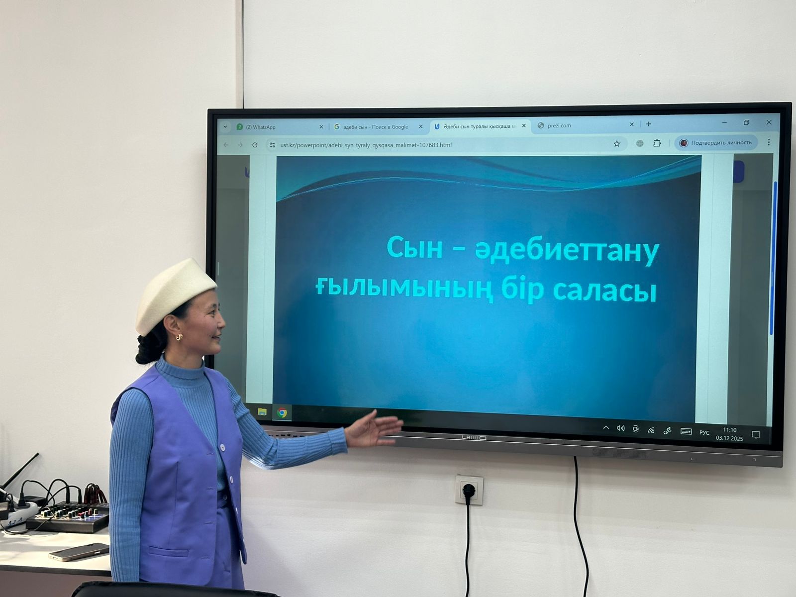 ТДМ 16 бағытына сәйкес қазақ әдебиеті және әдебиет теориясы кафедрасының аға оқытушысы Ш.А. Шортанбайдың жетекшілігімен 3-ші желтоқсан күні «қазақ тілі мен әдебиеті» мамандығының 3-курс студенттері «Әдеби сынды оқыту» тақырыбында ашық әңгіме сағатын өткізді. Іс-шараның негізгі мақсаты – студентке көркем туындыға объективті, ғылыми талдау жасау дағдысын қалыптастыру. Қазақ әдеби сынының тарихы мен даму кезеңдерін меңгерту. Сыншылық ойлау, шығарманы бағалау мәдениетін дамыту. Жазба және ауызша аналитикалық қорытынды жасау қабілетін жетілдіру.