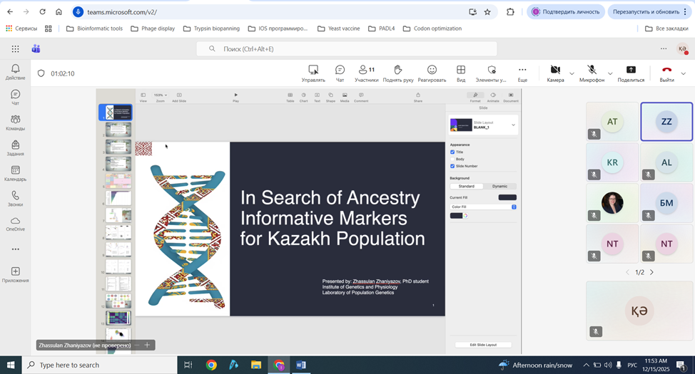 2025 жылғы 12 желтоқсанда «Генетика» білім беру бағдарламасының 3-курс докторанттарының ғылыми-зерттеу жұмысына арналған ғылыми семинары өтті. Семинар барысында Тұрақты даму мақсаттарының (ТДМ) бірнеше бағыттарымен, атап айтқанда ТДМ 2 «Аштықты жою» және ТДМ 3 «Салауатты өмір салты және әл-ауқат» мақсаттарымен байланысты баяндамалар ұсынылып, талқыланды. Ғылыми семинар молекулалық биология және генетика кафедрасында өтіп, кафедра оқытушыларының қатысуымен ұйымдастырылды, онда қатысушылар ғылыми нәтижелер мен идеялармен алмасты.