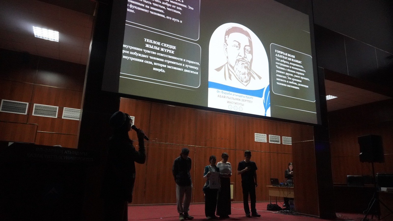 Ең алдымен, студенттерге үлкен экраннан АБАЙ ҒЫЛЫМИ-ЗЕРТТЕУ ИНСТИТУТЫНЫҢ РЕСМИ САЙТЫНДАҒЫ " ЕКІ ТОРҒАЙДЫҢ ӘҢГІМЕСІ" МЫСАЛ ӘҢГІМЕСІ көрсетілді. Одан соң сөз алған Абай ҒЗИ доценті Л.Ж.Мұсалы «адамдық пәні – Абай ілімі» екенін атап өтіп, студенттерге сабақ шарттарын түсіндіріп, студенттерді «АБАЙ айтқандай, "өзің үшін еңбек етпей», «КӨПТІҢ ИГІЛІГІ ҮШІН " еңбек етіп, білгенімен бөлісуге шақырды.