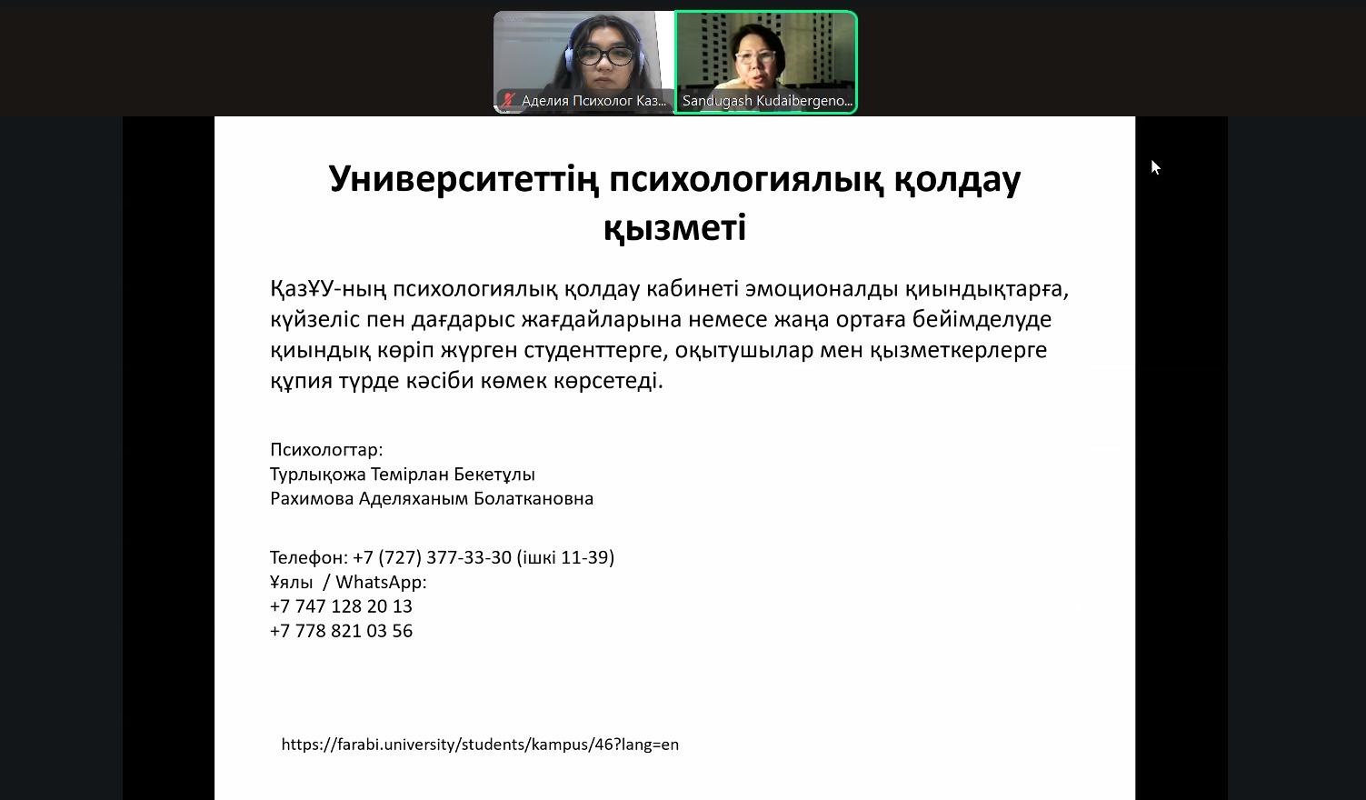 An online conference for international students of the Faculty of Philology and Journalism was held, focusing on issues of psychological adaptation and support within the educational environment of Kazakhstan.