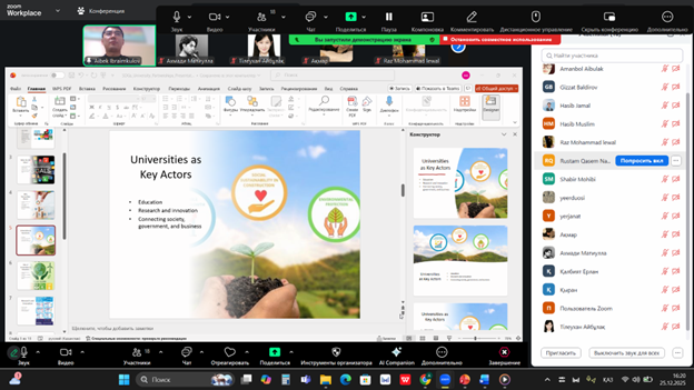 During the video lecture, the main principles of partnership for achieving the SDGs were highlighted, and the role of universities in sustainable development was emphasized. Examples of projects carried out by educational institutions in collaboration with government bodies, the private sector, and non-governmental organizations were also presented.