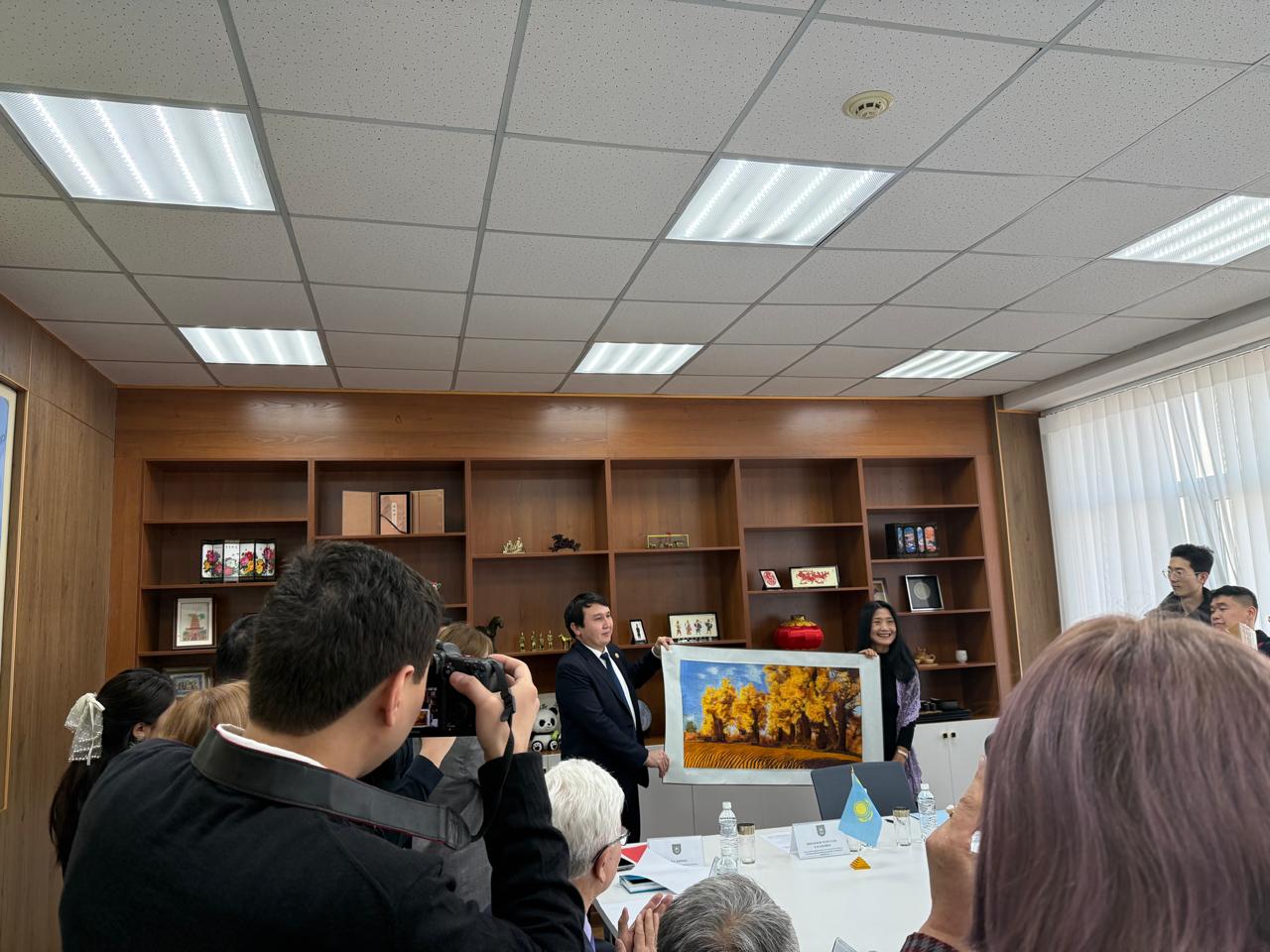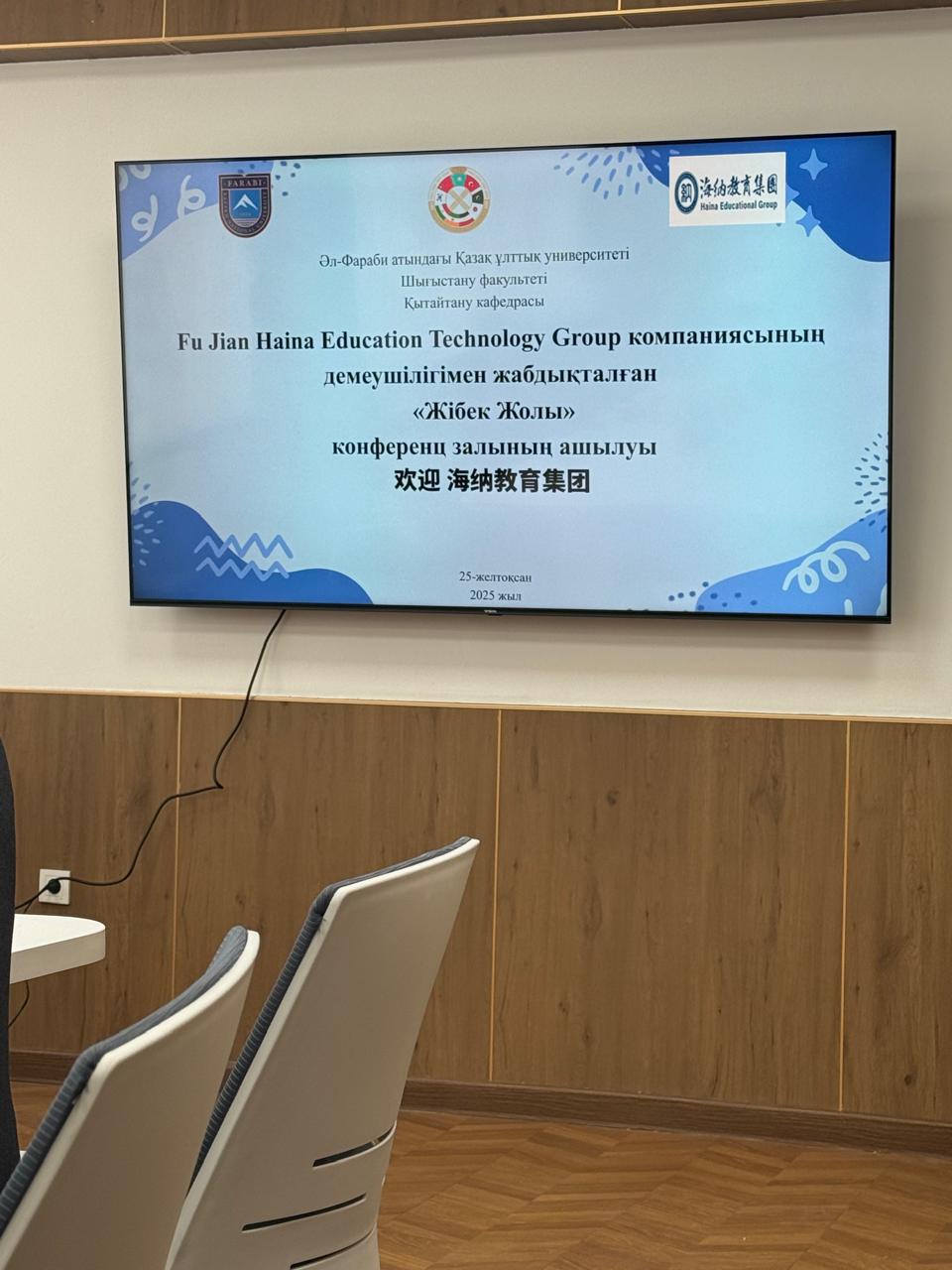 2025 жылғы 25 желтоқсанда Әл-Фараби атындағы Қазақ ұлттық университетінің Шығыстану факультетінде «Fu Jian Haina Education Technology Group» компаниясының демеушілігімен «Жібек Жолы» конференц залының салтанатты ашылу рәсімі өтті. Қытайтану саласындағы білім мен ғылыми-зерттеу жұмыстарын қолдауға бағытталған бұл жоба – Қытайтану кафедрасы мен «Fu Jian Haina Education Technology Group» компаниясының арасындағы серіктестіктің жемісі. Салтанатты рәсімнің тұсаукесерін Әл-Фараби атындағы Қазақ ұлттық университетінің Басқарма мүшесі – Ғылыми-инновациялық қызмет жөніндегі проректор Ибраимов Маргулан Касенович пен «Fu Jian Haina Education Technology Group» компаниясы төрағасы Wu Keping мырза жасады. Сонымен қатар іс-шараға Алматы қаласындағы ҚХР Бас консулдығының білім жөніндегі консулы Хуан Сяоминь ханым қатысты. Шығыстану факультетінің ардагер ұстаздары мен профессорлық-оқытушы құрамы, студенттер де көптен күткен залдың ашылуына куә болды. Ибраимов Маргулан Касенович «Fu Jian Haina Education Technology Group» компаниясының төрағасы Wu Keping мырзаға университет атынан алғыс хат табыстады. Fu Jian Haina Education Technology Group компаниясының толық қаржыландыруымен ашылып отырған «Жібек Жолы» конференц залы – көне өркениеттерді жалғаған Ұлы Жібек жолының рухын жаңғыртып, академиялық диалог пен ғылыми пікір алмасудың жаңа орталығына айналатынына сеніміміз мол. Бұл зал Қазақстан мен Қытай арасындағы білім беру, ғылым және мәдени байланыстарды одан әрі нығайтып, болашақ шығыстанушылар мен қытайтанушылар үшін маңызды алаң болмақ. Бұл бастама – Қазақстан мен Қытай арасындағы мәдени және академиялық байланыстарды нығайтуға бағытталған маңызды қадам.