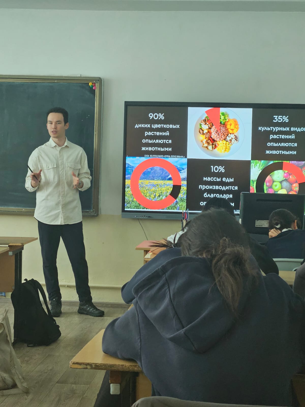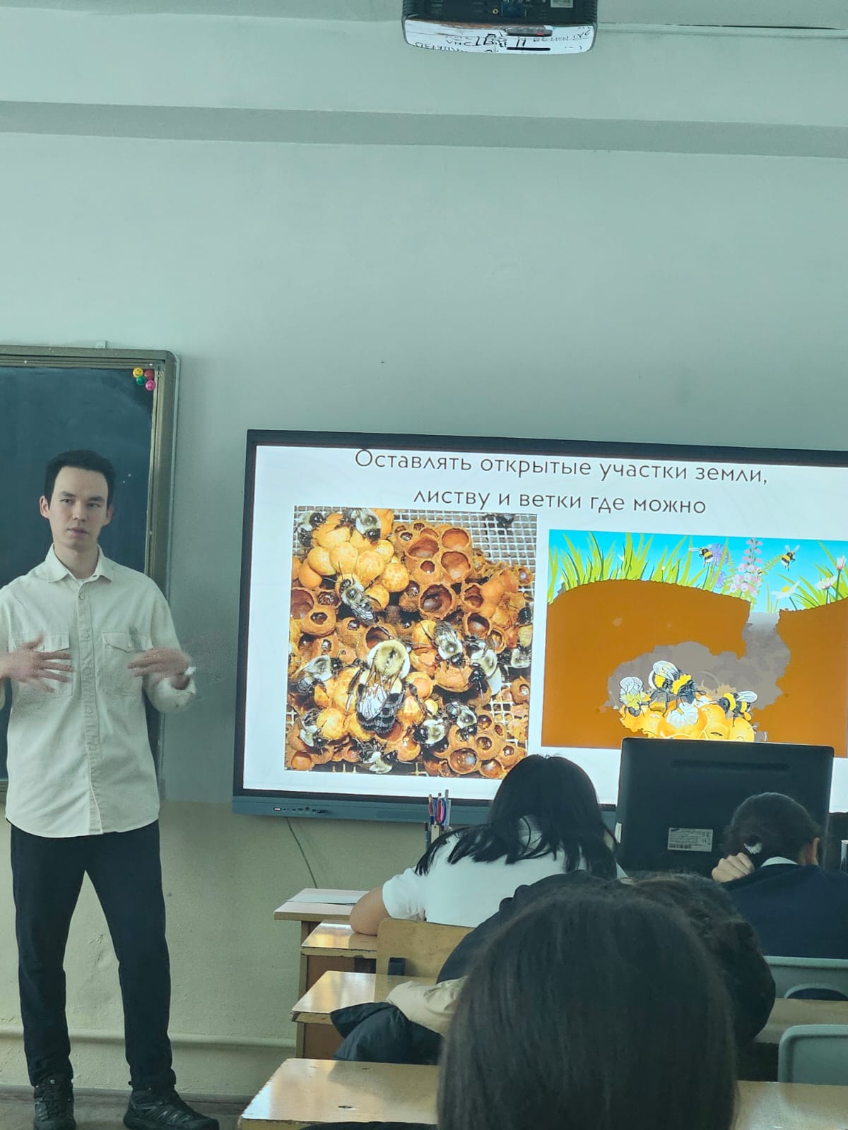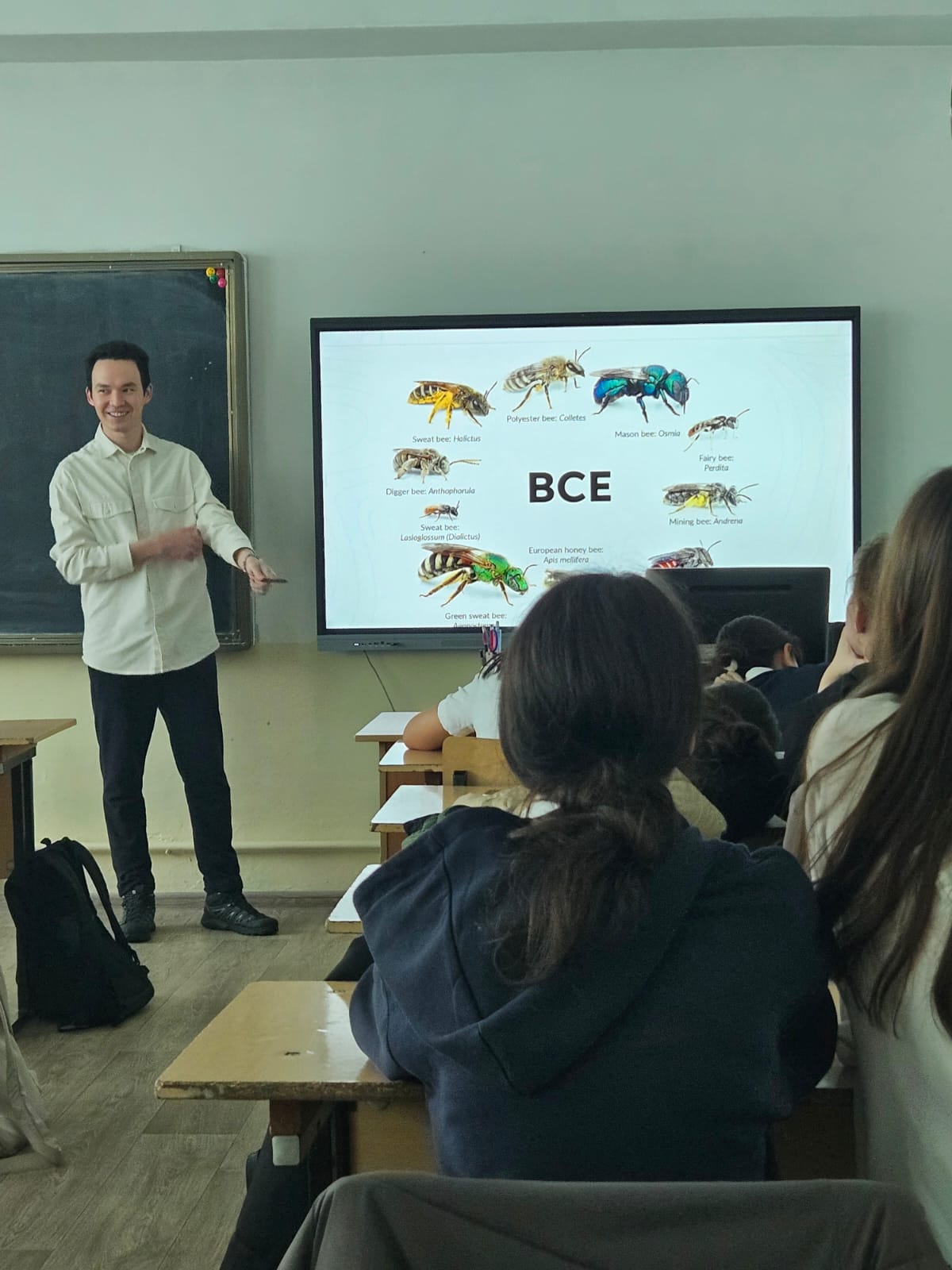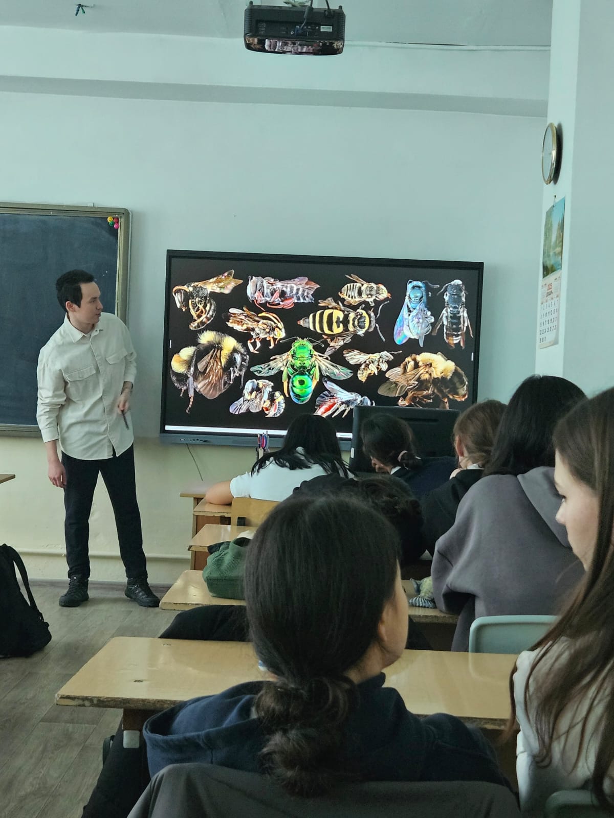 On December 23, 2025, an environmental lecture for 10th-grade students was held at Almaty Lyceum No. 134. The lecture was titled "Pollinating Insects and Bees: Biodiversity, Their Role in the Ecosystem, and How Can They Be Studied and Conserved?" The event was organized in partnership with the citizen science project " Aralap " ( Pollinators.kz ) , a scientific and educational initiative by young scientists at KazNU to study and conserve pollinators in Kazakhstan.