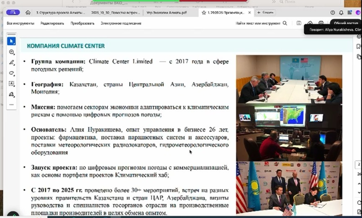 On October 30, 2025, Al-Farabi Kazakh National University hosted an online meeting on implementing digital forecasting technologies for managing air quality in Almaty. The event was supported by Climate Center and Almaty Development Center JSC, with participation from research institutions and environmental experts.
