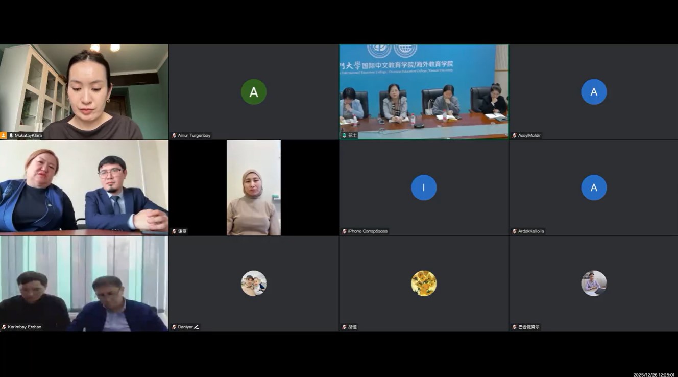 26 декабря 2025 года на факультете востоковедения Казахского национального университета имени аль-Фараби в онлайн-формате состоялась международная академическая встреча с преподавателями Сямэньского университета (КНР). Целью мероприятия стало установление партнерства со Сямэньским университетом, обсуждение совместных научных проектов, развитие совместных образовательных программ, а также обзор опыта зарубежного университета по реализации Целей устойчивого развития (ЦУР). Встреча была организована в рамках Цели устойчивого развития ЦУР 4 – Качественное образование и ЦУР 17 – Партнерство в интересах устойчивого развития.