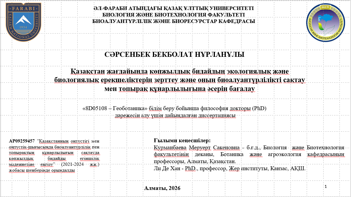 08.01.2026 г. на факультете биологии и биотехнологии, на кафедре ботаники и агроэкологии КазНУ имени аль-Фараби (каб. 214) состоялась предварительная защита на тему «Изучение экологических и биологических особенностей многолетней пшеницы в условиях Казахстана и оценка ее влияния на сохранение биоразнообразия и плодородие почв». В ходе мероприятия обсуждались потенциал многолетних культур для секвестрации углерода в почве, устойчивость агроландшафтов и вопросы повышения плодородия почв. Мероприятие было организовано в соответствии с ЦУР 2 и ЦУР 15.