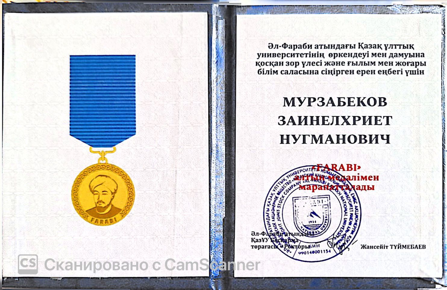 Доктор технических наук, профессор кафедры информационных систем Мурзабеков Зайнелхриет Нугманович за значительный вклад в развитие Казахского национального университета имени аль-Фараби, а также в сферу науки и высшего образования награждён медалью «Farabi».