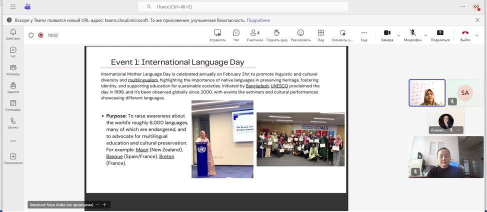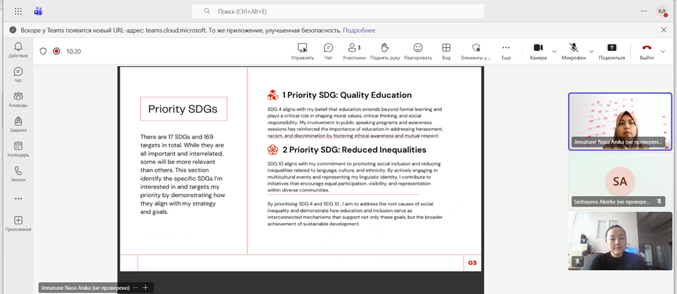 2026 жылғы 16 қаңтарда Молекулалық биология және генетика кафедрасында кездесу өтті. Кездесу барысында Джиннатуне Наса Аника Қазақстандағы Біріккен Ұлттар Ұйымының белсенді делегаты ретінде БҰҰ-дағы еріктілік тәжірибесін таныстырды. Презентация Тұрақты даму мақсаттарының 4-ші (Сапалы білім) және 10-шы (Теңсіздікті азайту) мақсаттарына арналды.