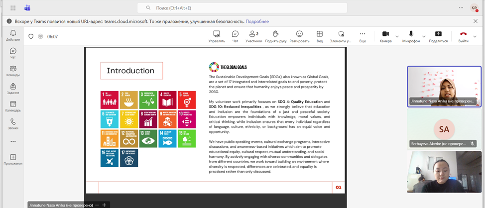 On 16 January 2026, a meeting was held at the Department of Molecular Biology and Genetics, during which Jinnatune Nasa Anika presented her volunteer practice with the United Nations as an active delegate of the United Nations of Kazakhstan. The presentation focused on Sustainable Development Goal 4 (Quality Education) and Sustainable Development Goal 10 (Reduced Inequalities).