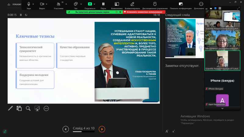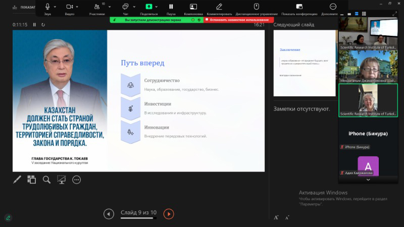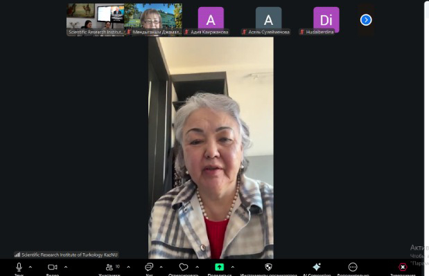 ҚазҰУ-дың Орыс филологиясы және әлем әдебиеті кафедрасының профессоры Нұрсұлу Шаймерденова «Жаңа мемлекеттік бағдарлар аясындағы түркологиялық зерттеулердің заманауи сын-қатерлері мен басымдықтары» тақырыбында баяндама жасап, кездесудің негізгі мақсаттарын айқындады. Ол Ұлттық құрылтай отырысында Президенттің сөйлеген сөзінің басты тұжырымдарын талдап, жалпы ғылымда, атап айтқанда Түркология және алтаистика ҒЗИ қызметінде іргелі және қолданбалы зерттеулердің басым бағыттарына тоқталды.