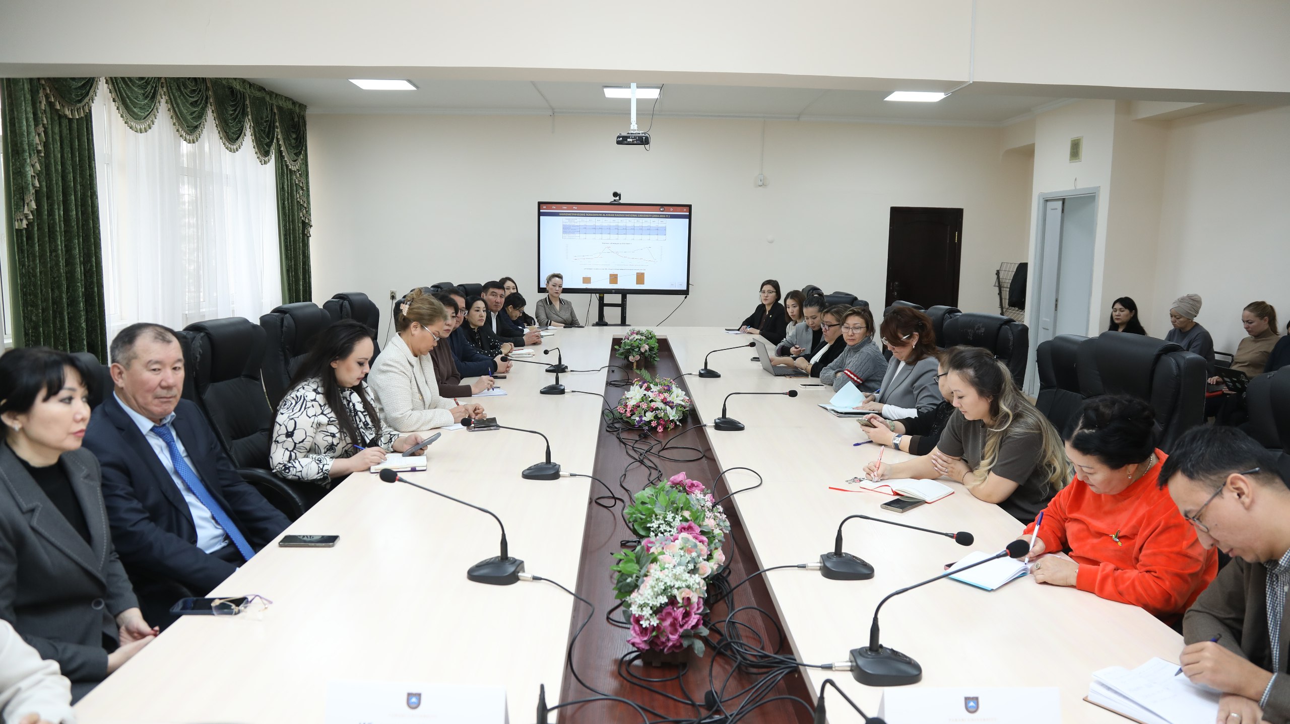 Кездесу барысында ҚазҰУ-дың Басқарма мүшесі – ғылыми-инновациялық қызмет жөніндегі проректор Марғұлан Ибраимов университеттегі ғылыми қызметтің қазіргі ахуалына жан-жақты тоқталып, соңғы жылдары ғылыми жарияланымдар санының бір жарым есеге артқанын, сондай-ақ дәйексөз келтіру көрсеткіштерінің де тұрақты өсім көрсетіп отырғанын атап өтті. Дегенмен алдағы кезеңде бұл бағыттар бойынша жұмысты одан әрі күшейту қажеттігін айтты.