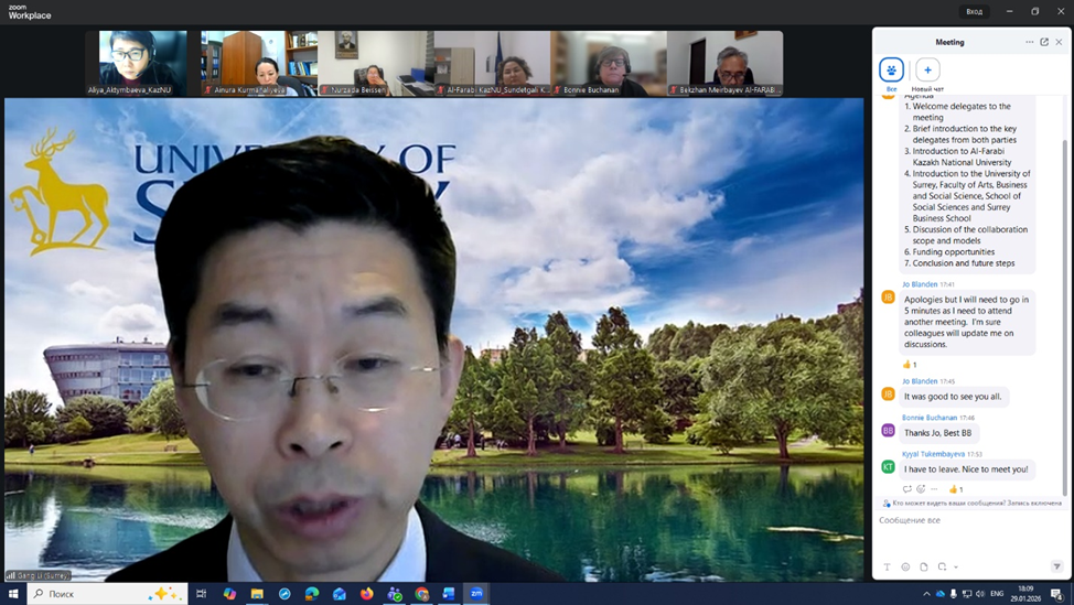 On 29 January, an online meeting was held between representatives of Al-Farabi Kazakh National University and the University of Surrey, aimed at establishing a sustainable institutional platform for interdisciplinary academic collaboration in the field of sustainable tourism. The primary objective of the cooperation was to develop dual-degree educational programmes, implement joint academic and research projects, expand academic mobility of students and faculty members, and exchange advanced international practices in sustainable territorial development and tourism studies.