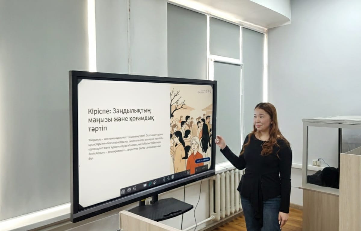 Сонымен қатар іс-шара барысында өмірден алынған нақты жағдайлар мен қоғамдық тәжірибеден мысалдар қарастырылды. Қатысушылар құқықтық сананы қалыптастыру, заңдық білім деңгейін арттыру және белсенді азаматтық ұстаным құқық бұзушылықтар санын азайтуға ықпал ететіні жөнінде пікір алмасты. Кездесу қорытындысы бойынша студенттер ағартушылық бағыттағы қысқаша баяндамалар мен ақпараттық материалдар дайындады.