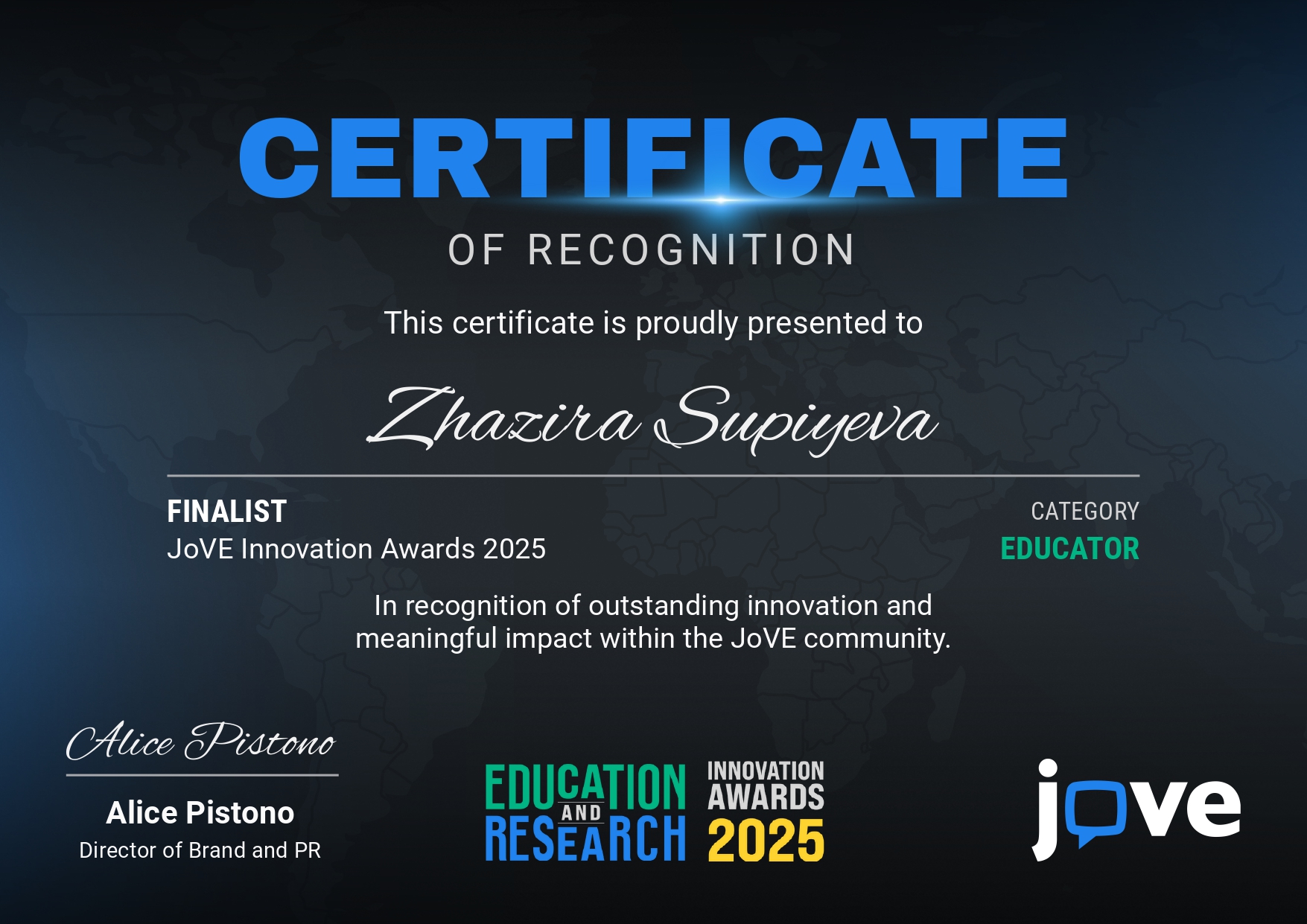 Әл-Фараби атындағы ҚазҰУ-дың Физикалық химия, катализ және мұнай химиясы кафедрасының оқытушысы Жазира Супиева JoVE Education & Research Innovation Awards 2025 халықаралық сыйлығының Educator Innovation Award номинациясы бойынша финалдық бестікке енді. Финалистер қатарында АҚШ, Малайзия және Чили елдерінің өкілдері бар.