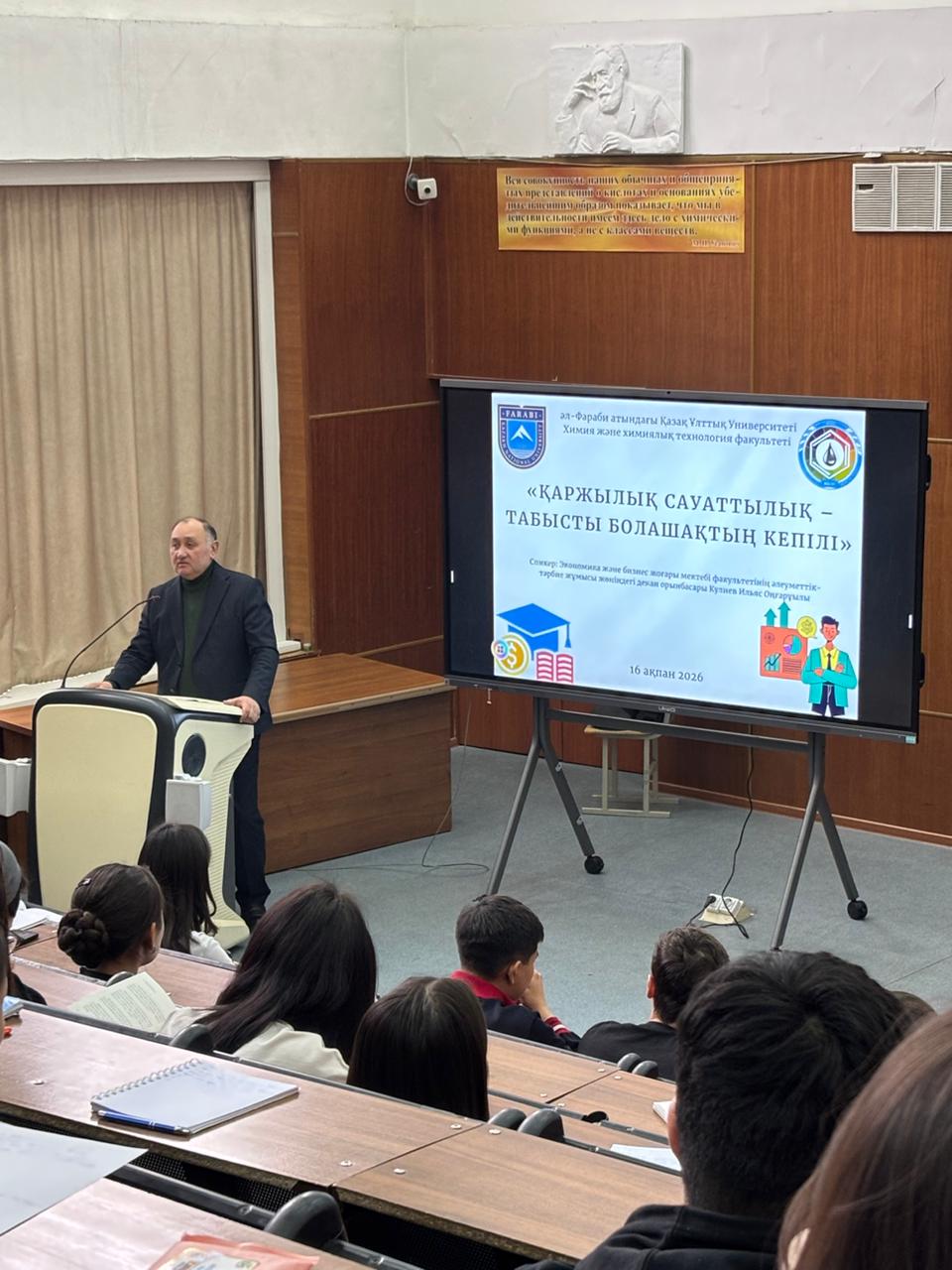 16 февраля в рамках плана «ФИНАНСОВАЯ ГРАМОТНОСТЬ» на факультете химии и химической технологии Казахского национального университета имени аль-Фараби состоялся семинар для студентов 1 курса на тему «ФИНАНСОВАЯ ГРАМОТНОСТЬ – ЗАЛОГ УСПЕШНОГО БУДУЩЕГО». Спикером семинара выступил заместитель декана по социально-воспитательной работе Высшей школы экономики и бизнеса, старший преподаватель Кулиев Ильяс Онгарулы. Цель семинара: формирование финансовой культуры студентов, развитие навыков эффективного управления личными финансами и повышение финансовой ответственности как основы их будущей экономической стабильности. Задачи семинара: разъяснение способов планирования личного и семейного бюджета; обучение методам эффективного управления доходами и расходами; раскрытие значения финансовой безопасности и формирования сбережений; предоставление базовой информации о кредитовании, депозитах и инвестициях; разъяснение способов защиты от финансового мошенничества; развитие критического мышления студентов в сфере финансов.