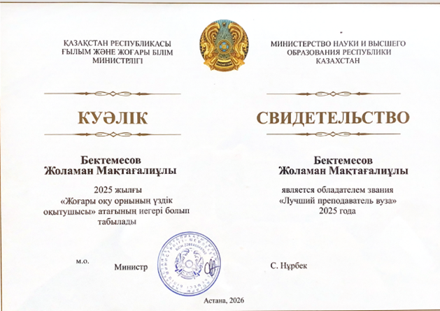 Бектемесов Жоламан Мақтағалиұлы – «Жоғарғы оқу орнының үздік оқытушысы – 2025»