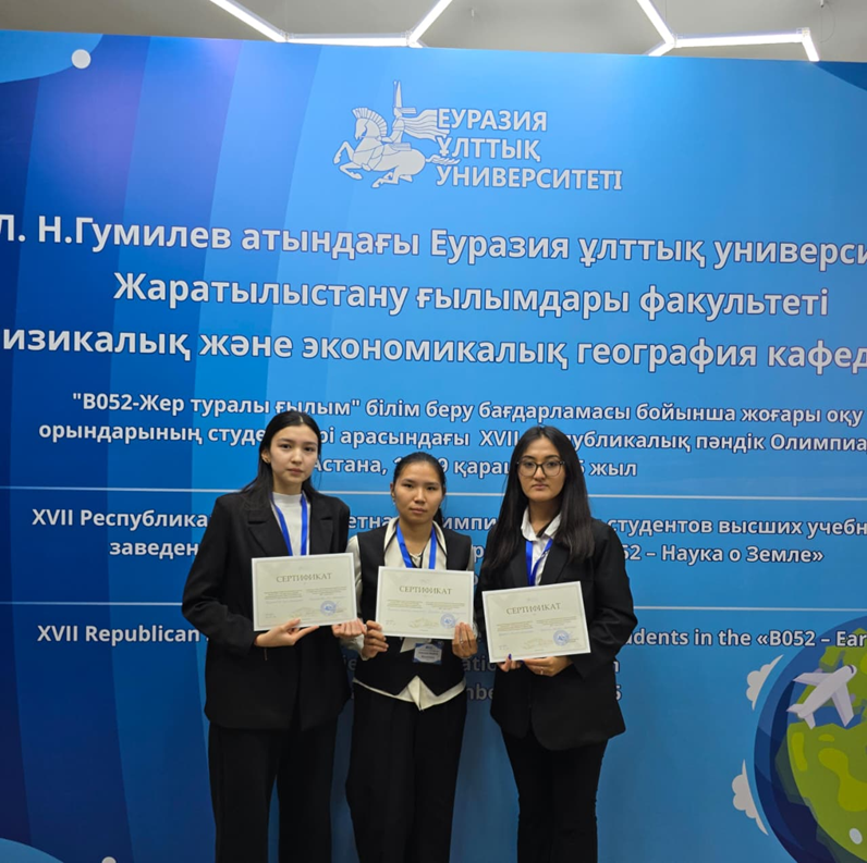 Преподаватель кафедры географии, землеустройства и кадастра Құрбанқожа Нұрдәулет Әділұлы (руководитель) и студенты 3 курса образовательной программы 6В050205 – «География» Жүнісханова Әсел, Бейсенбай Жанбибі, Құсайын Ақниет 18–19 ноября 2025 года в городе Астана приняли участие в XVII Республиканской предметной олимпиаде и заняли почётное 3 место.