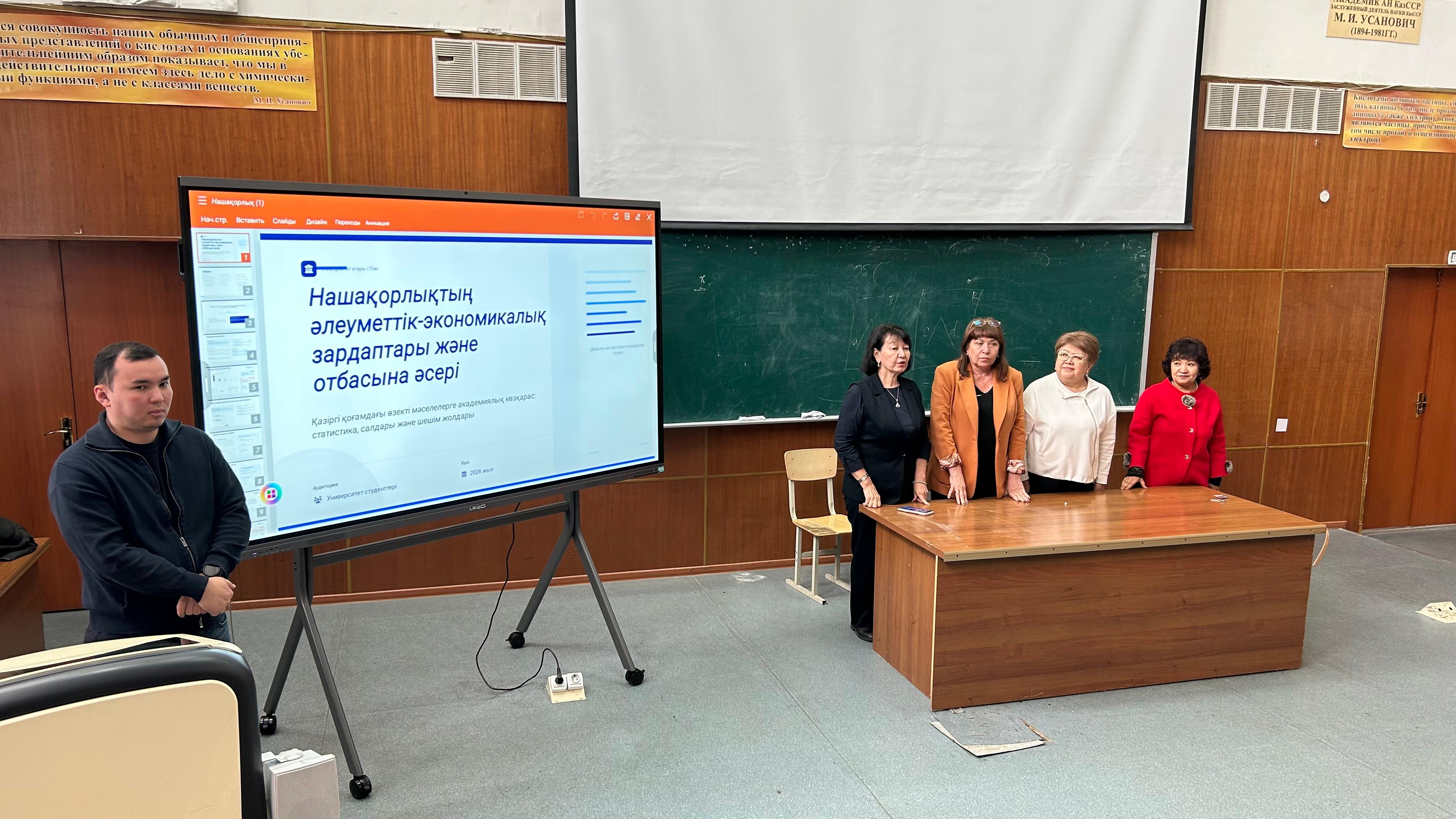 25 ақпан 2026 жылы Химия және химиялық технология факультетінде «Таза Қазақстан» бағыты аясында «ДЕНІ САУ ӨМІР САЛТЫ ЖӘНЕ ӘЛ-АУҚАТ (ТДМ-3)». «Нашақорлықтың әлеуметтік-экономикалық зардаптары және отбасына әсері», «Депрессия және суицид» тақырыптарында КЕРЕМЕТ медициналық орталығының меңгерушісі Е.Ж. Жаксыхановтың дәрісі өткізілді. Бұл іс-шараны ұйымдастыруға жалпы және бейорганикалық химия кафедрасының доценттері Бейсембаева Л.К., Рыскалиева Р.Г., Пономаренко О.И., Балғышева Б.Д. ат салысты. Іс-шараға факультеттің әлеуметтік-тәрбие жұмыстары жөніндегі декан орынбасары Жақсылықова Г.Ж. қатысты. Жалпы студенттерге осындай дәрістерді ұйымдастыру өте қажет болып табылады. Әсіресе, 1 курс студенттері жан-жақтан келіп, жаңа ортаға үйренісе бастағанда оларға бағыт беру, әртүрлі мәселелерді түсіндіру, жеке тақырыптарда дәріс оқу өте пайдалы болып табылады. Соның ішінде нашақорлық – қазіргі заманның ең өзекті мәселелерінің бірі. Бұл тек жеке тұлғаға ғана емес, қоғамға да үлкен зиян келтіреді. Нашақорлықтың әлеуметтік және экономикалық зардаптары өте кең ауқымды. Оның әсері тек тұрмыстық деңгейде ғана емес, мемлекеттердің даму деңгейіне де теріс ықпал етеді. Бүгінгі таңда нашақорлықтың адам өміріне, қоғамға және экономикаға тигізетін әсері туралы терең талдау жасау маңызды болып табылады.