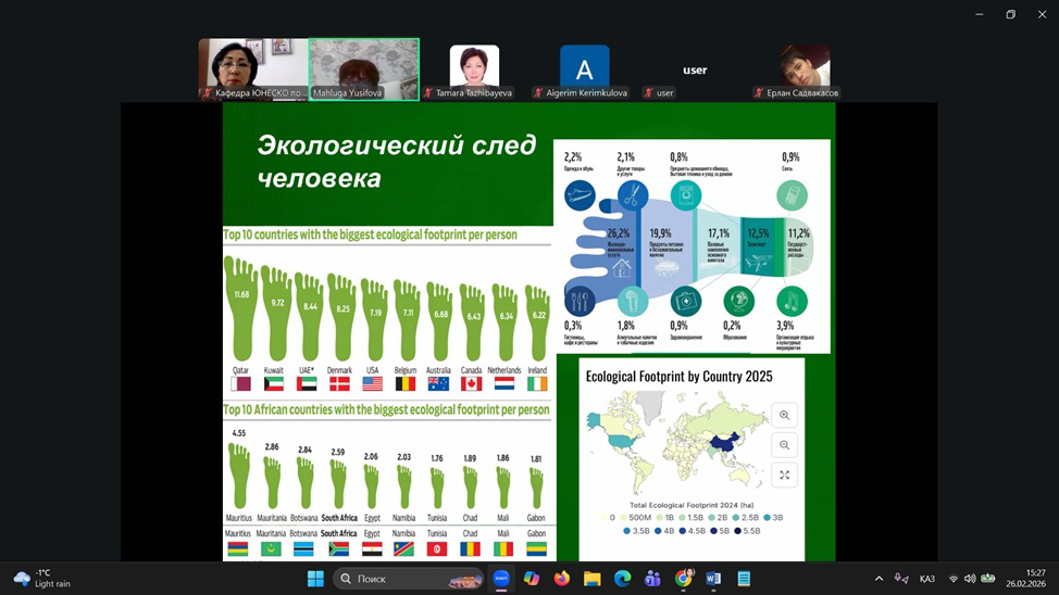 26 февраля 2026 года по инициативе кафедры ЮНЕСКО по устойчивому развитию факультета географии и природопользования и при поддержке Бакинского государственного университета (Азербайджан), Кыргызского национального университета имени Ж. Баласагына (Кыргызстан) и Центрально-Азиатско-Германского института по защите экосистем и биоразнообразия начала свою работу I Международная онлайн зимняя школа на тему «Сортировка и утилизация твердых бытовых отходов». Мероприятие проводится в преддверии Международного дня нулевых отходов (ZeroWaste Day). Модератор мероприятия – заведующая кафедрой ЮНЕСКО по устойчивому развитию БазарбаеваТурсынкул Аманкельдиевна.