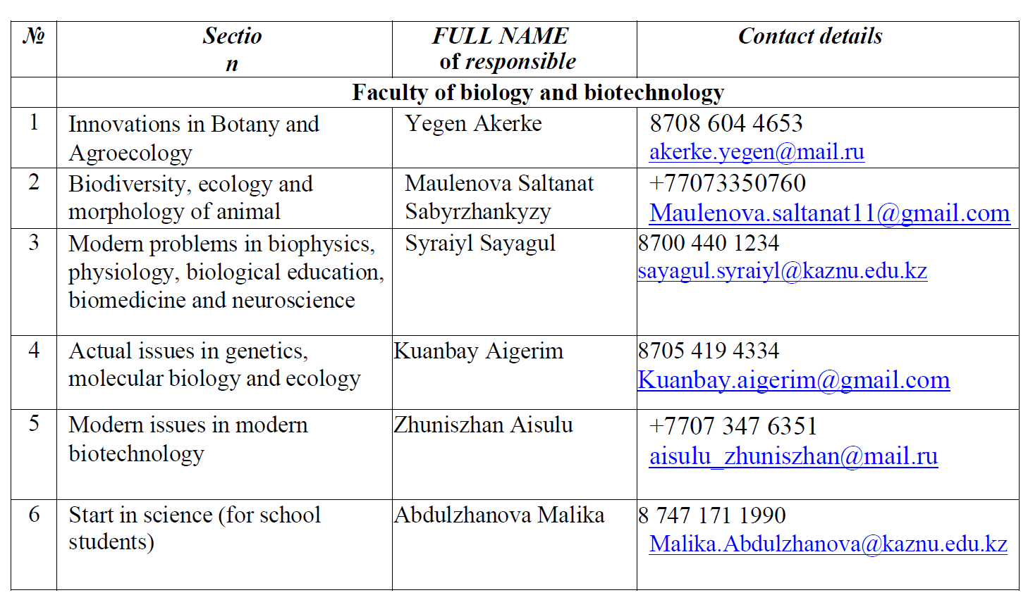 In the framework of the largest conference of students and young scientists, following sections are to operate at Al-Farabi KazNU Faculty of Biology and Biotechnology: