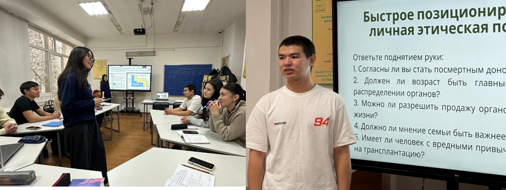 Трансплантология бөлімі Қазақстан Республикасында осы саланың дамуы мен қоғамдағы қабылдануына арналды. Студенттер донорлық мәдениет, ақпараттандырылған келісім, «келісім» және «келіспеушілік презумпциясы» ұғымдары, медициналық құпия, әділеттілік қағидаты және қоғам сенімі сияқты күрделі мәселелерді талдады. Биоэтиканың негізгі принциптері – автономия, игілік жасау, зиян келтірмеу және әділеттілік – нақты ситуациялық мысалдар арқылы қарастырылып, шешім қабылдаудағы тәуекелдер мен ықтимал салдарлар бағаланды. Сонымен қатар, Қазақстанда биомедицинаның осы бағытын дамыту перспективаларына тоқталып, заңнамалық реттеу, ашық коммуникация, кәсіби этика нормаларын сақтау және ағартушылық жұмысты күшейту қажеттігі атап өтілді.