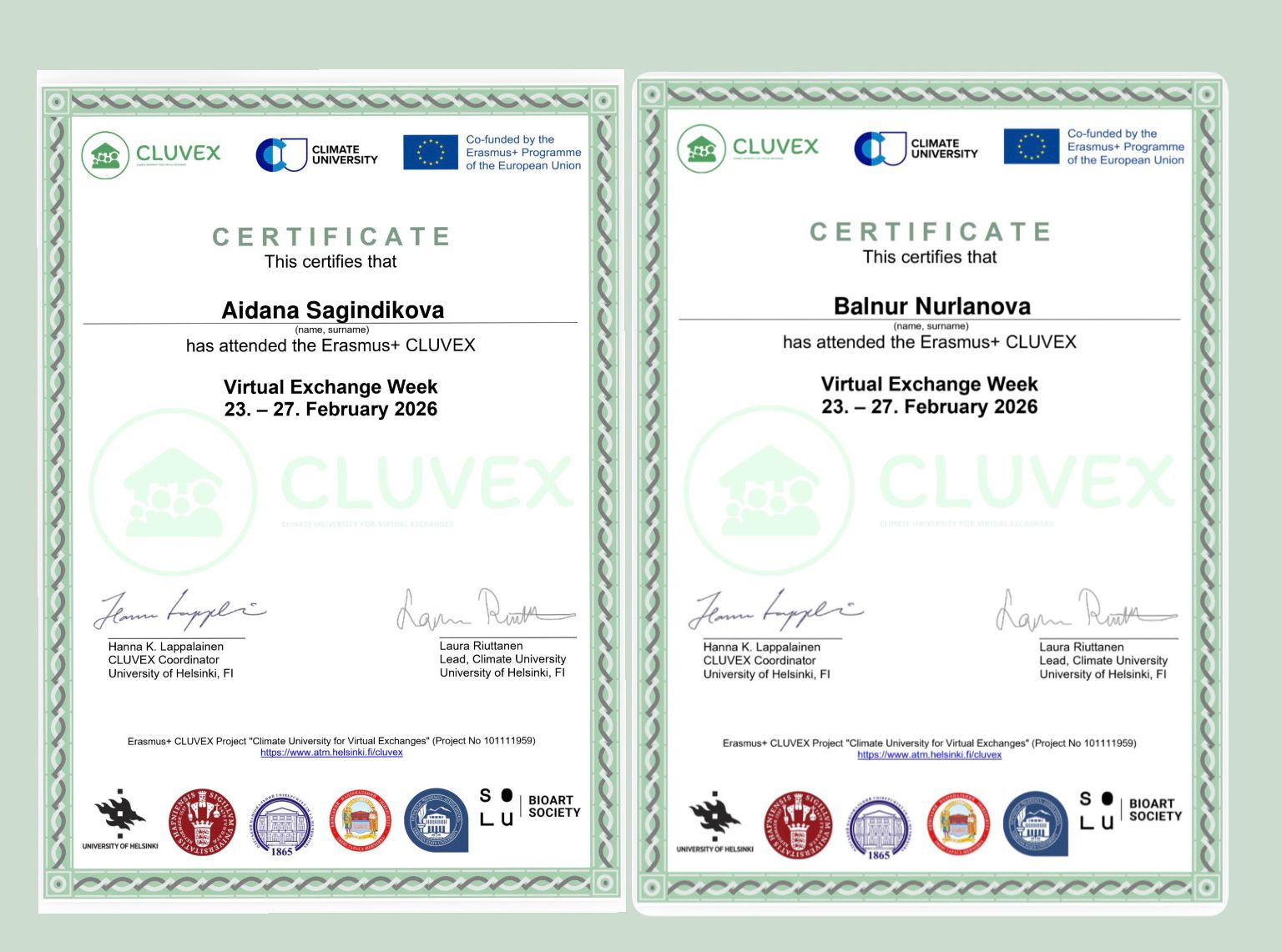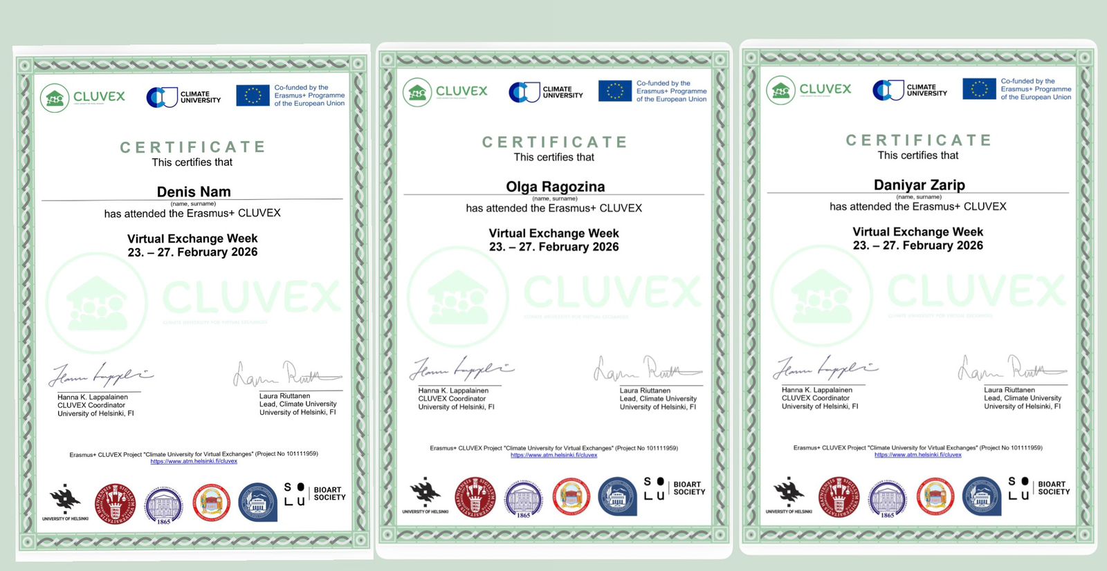 Метеорология және гидрология кафедрасының студенттері мен магистранттары University of Helsinki ұйымдастырған халықаралық онлайн-курс CLUVEX (Climate University for Virtual Exchanges) бағдарламасына қатысты. Курс климаттық өзекті мәселелерге және су ресурстарын тұрақты басқаруға арналған (ТДМ 6 Таза су және санитария), сонымен қатар қатысушыларға әртүрлі пәндік көзқарастардан табиғи, әлеуметтік ғылымдар және өнер, білім алуға мүмкіндік берді.
