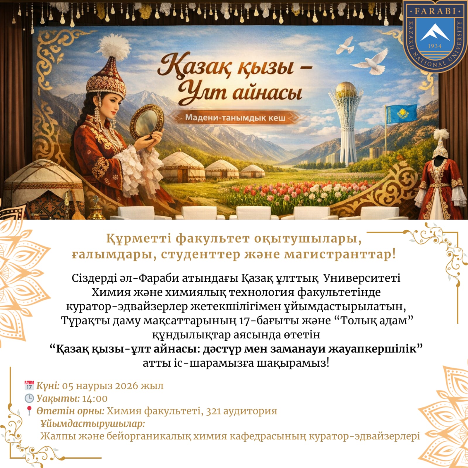 On March 5, 2026, a cultural and educational event titled “Kazakh Woman – the Mirror of the Nation: Tradition and Modern Responsibility” was held at the Faculty of Chemistry and Chemical Technology of Al-Farabi Kazakh National University. The event was organized by the curator-advisors of the Department of General and Inorganic Chemistry.