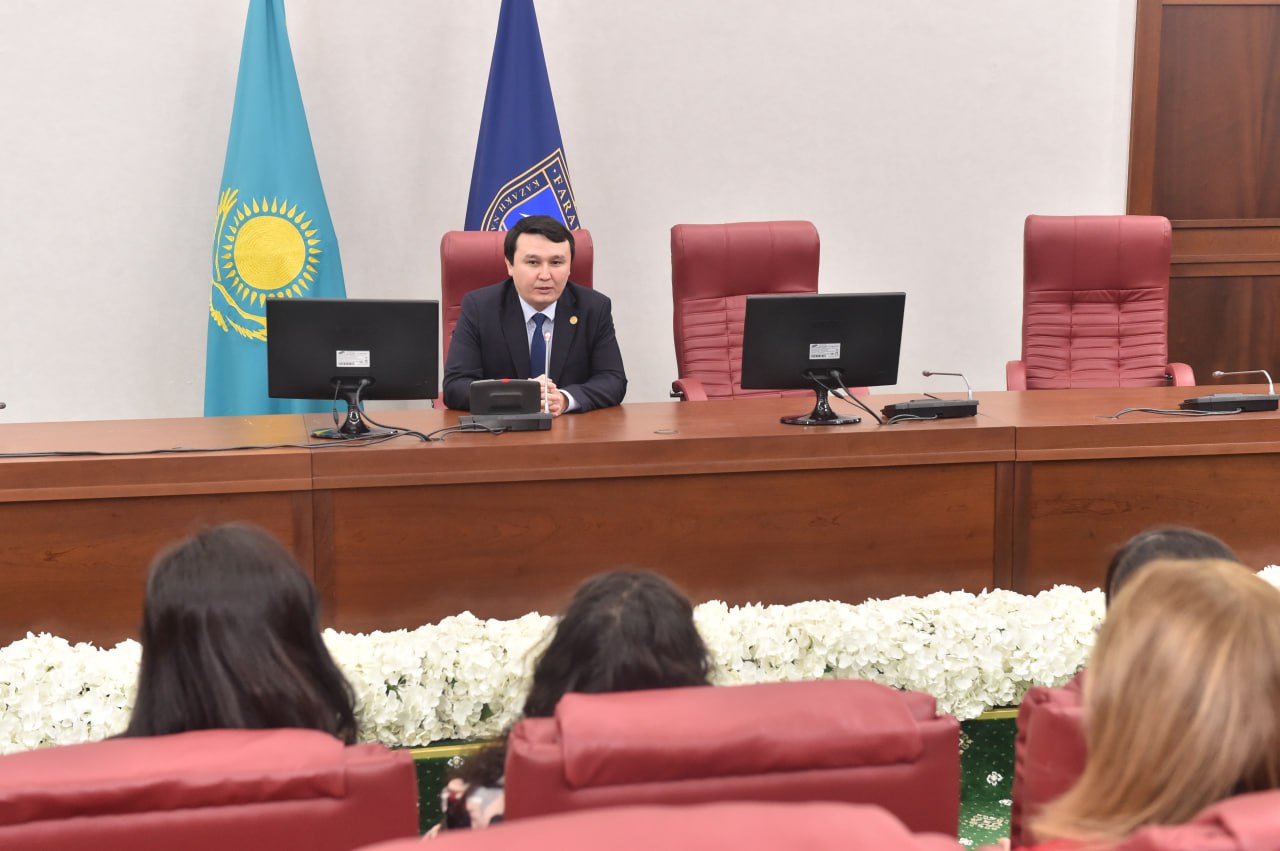 Жиын барысында ҚазҰУ Басқарма мүшесі – ғылыми-инновациялық қызмет жөніндегі проректор Марғұлан Ибраимов әріптестерін мерекемен құттықтады. Ол әйелдердің отандық ғылымды дамытудағы маңызды рөлін атап өтіп, олардың кәсібилігі, адал еңбегі және ғылыми жобаларды сәтті жүзеге асыруға қосқан үлесі үшін алғыс білдірді.