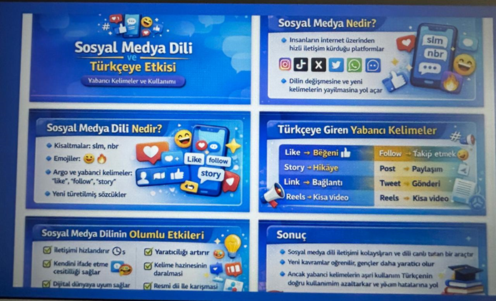 Открытое занятие на тему «Sosyal medya ve reklam dili» охватило актуальные тенденции развития языка в условиях цифровой эпохи, а также всесторонне рассмотрело особенности дискурса социальных медиа и рекламы. В ходе занятия студенты проанализировали структуру и функции языка социальных медиа, а также его влияние на турецкий язык. Кроме того, они изучили особенности языка рекламы и продемонстрировали свои творческие способности, создавая рекламные слоганы.