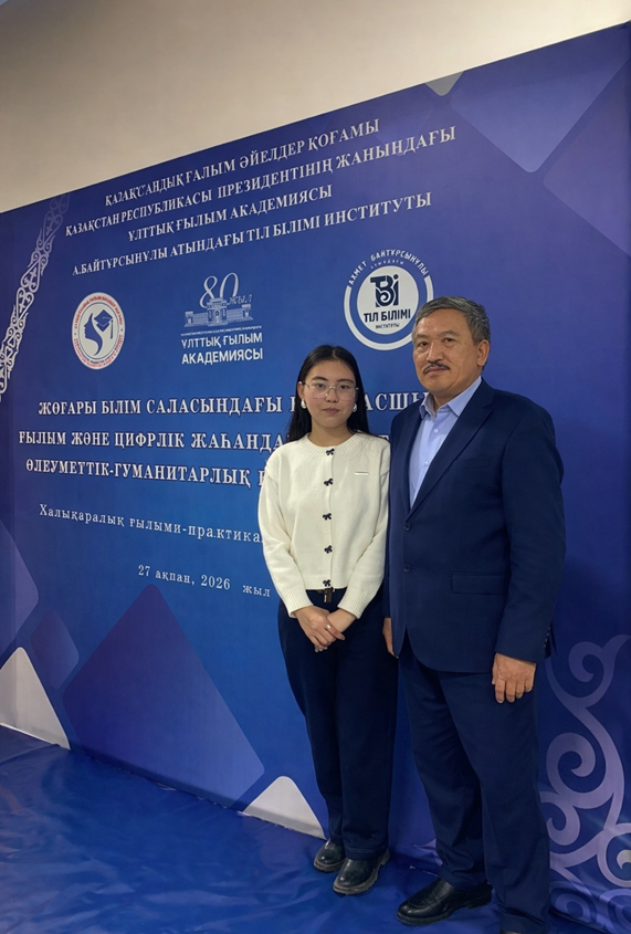 2026 жылдың 27 ақпанында «7M02326 – Цифрлы қазақ тілі» мамандығының 2-курс магистранты Әли Ш.Қ., оқытушы Сәрсенбай Ж., докторант-практикант Шуленбаев Н.К. Ғылым Ордасында өткен «Жоғары білім саласындағы көшбасшылық: ғылым және цифрлық жаһандану контекстіндегі әлеуметтік-гуманитарлық ғылымдардың рөлі» атты Халықаралық ғылыми-практикалық конференцияға қатысты.