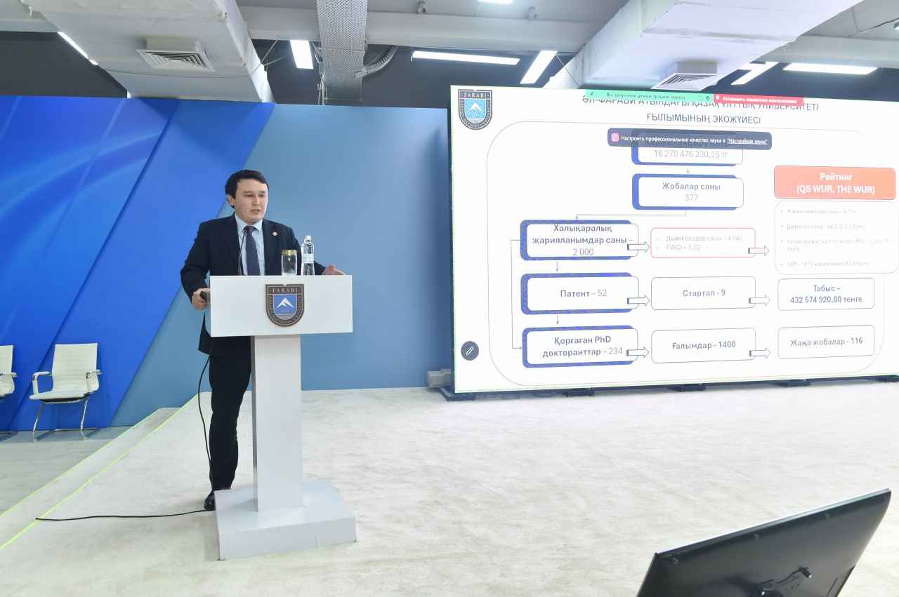 Негізгі баяндаманы жасаған Басқарма мүшесі – ғылыми-инновациялық қызмет жөніндегі проректор Марғұлан Ибраимов өткен жылғы қаржылық және статистикалық көрсеткіштерге тоқталды. Оның мәліметінше, 2025 жылы ғылыми-зерттеу жұмыстарына бағытталған жалпы қаржы көлемі 16,27 млрд теңгені құраған. Университет қабырғасында 377 ғылыми жоба іске асырылса, оның 116-сы – жаңа бастамалар. Бүгінде университетте 1400-ге жуық ғалым еңбек етеді, ал PhD дәрежесін қорғаған жас зерттеушілер саны 234-ке жетті.