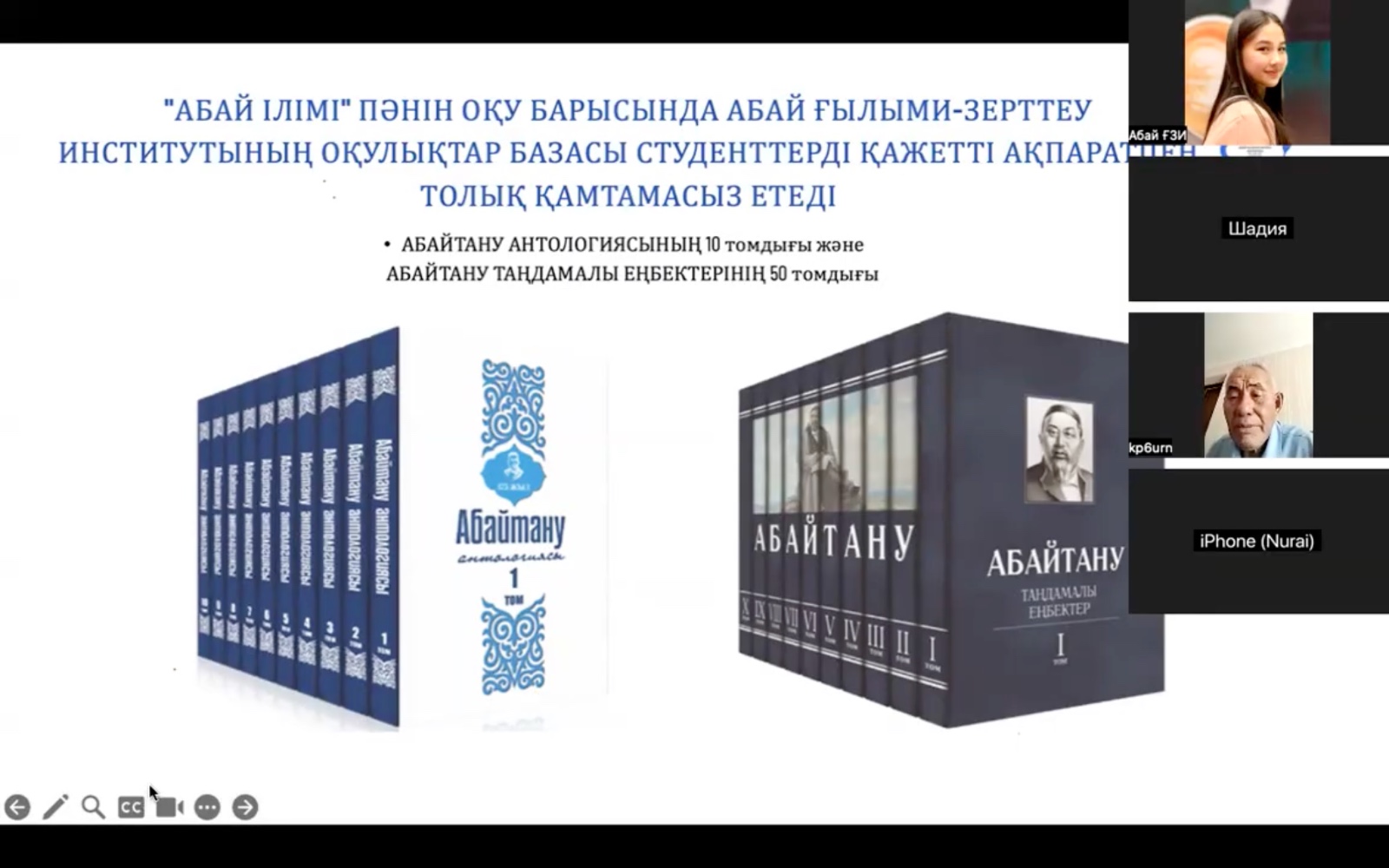 Кроме того, в данной лекции профессор института Торегельды Туякбай отметил важность учения Абая для формирования духовного богатства и повышения интеллектуального потенциала общества, сохранения исторической памяти его членов, воспитания искреннего уважения и любви к народу, обществу, человеку и Родине у молодёжи XXI века. Лекция внесла значительный вклад в расширение духовного кругозора студентов, их стремления к знаниям и границ творческих поисков.