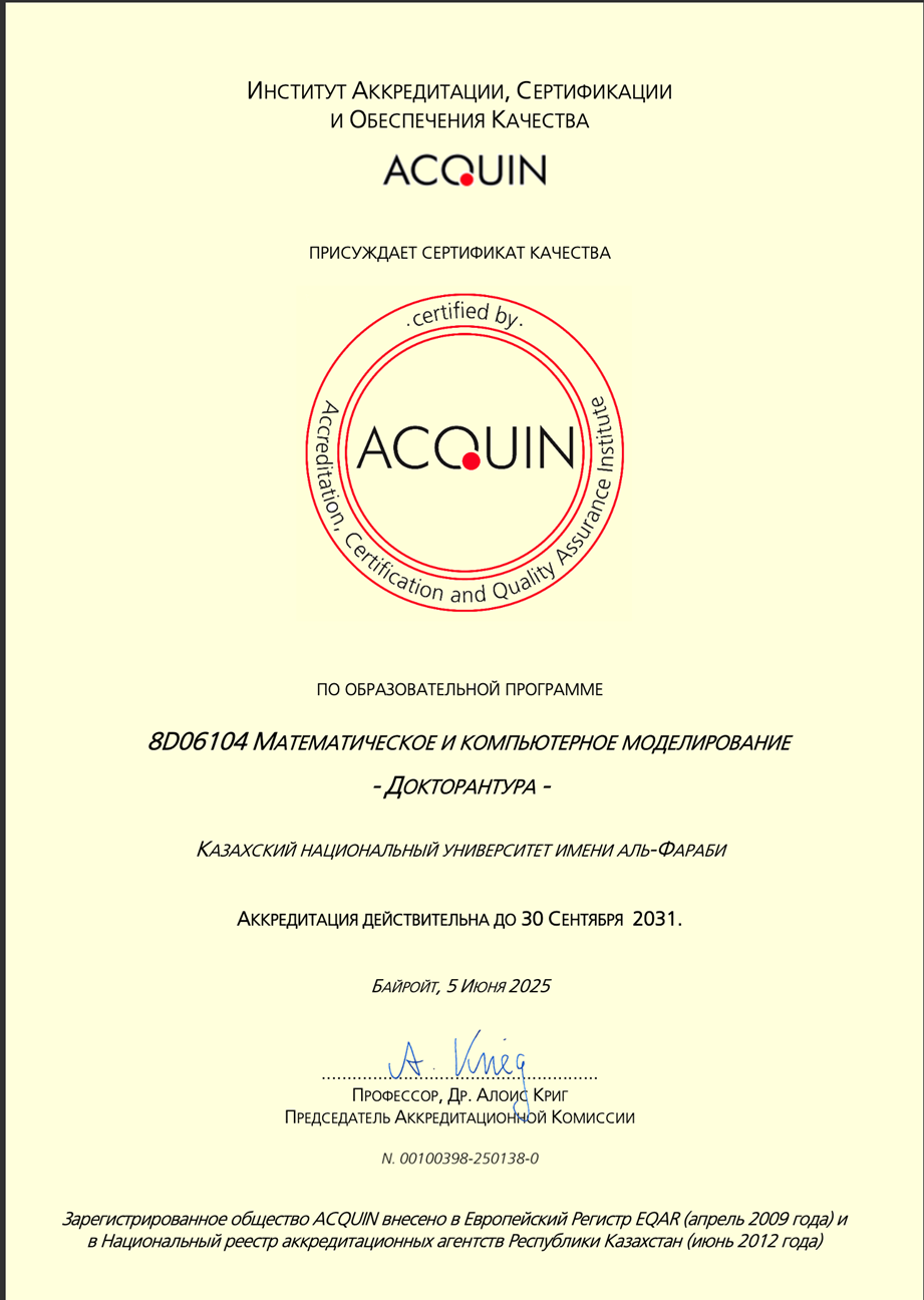 2025 жылдың 5 маусымында «Математикалық және компьютерлік модельдеу» білім беру бағдарламасы (докторантура, 8D06104) халықаралық ACQUIN институтынан сапа сертификатын алды.