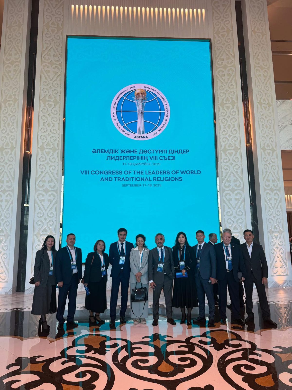 Әл-Фараби атындағы Қазақ ұлттық университетінің делегациясы құрамында философия және саясаттану факультетінің деканы Б.Б. Мейрбаев, дінтану және мәдениеттану кафедрасының меңгерушісі А.Д. Құрманалиева, факультет деканының орынбасары А.Н. Қарыбаева, профессор К.М. Бишманов, сондай-ақ ғылыми жобалардың жетекшілері У.А. Тұңғатова мен Р.С. Сарсембаев 2025 жылғы 17-18 қыркүйекте Астана қаласында өткен Әлемдік және дәстүрлі діндер лидерлерінің VIII съезіне қатысты.