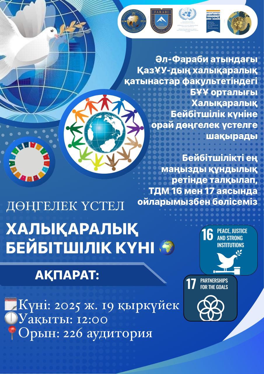 On Friday, 19 September 2025, the Academic Regional UN Information Resource Center at the Faculty of International Relations of Al-Farabi Kazakh National University hosted a roundtable dedicated to the International Day of Peace.