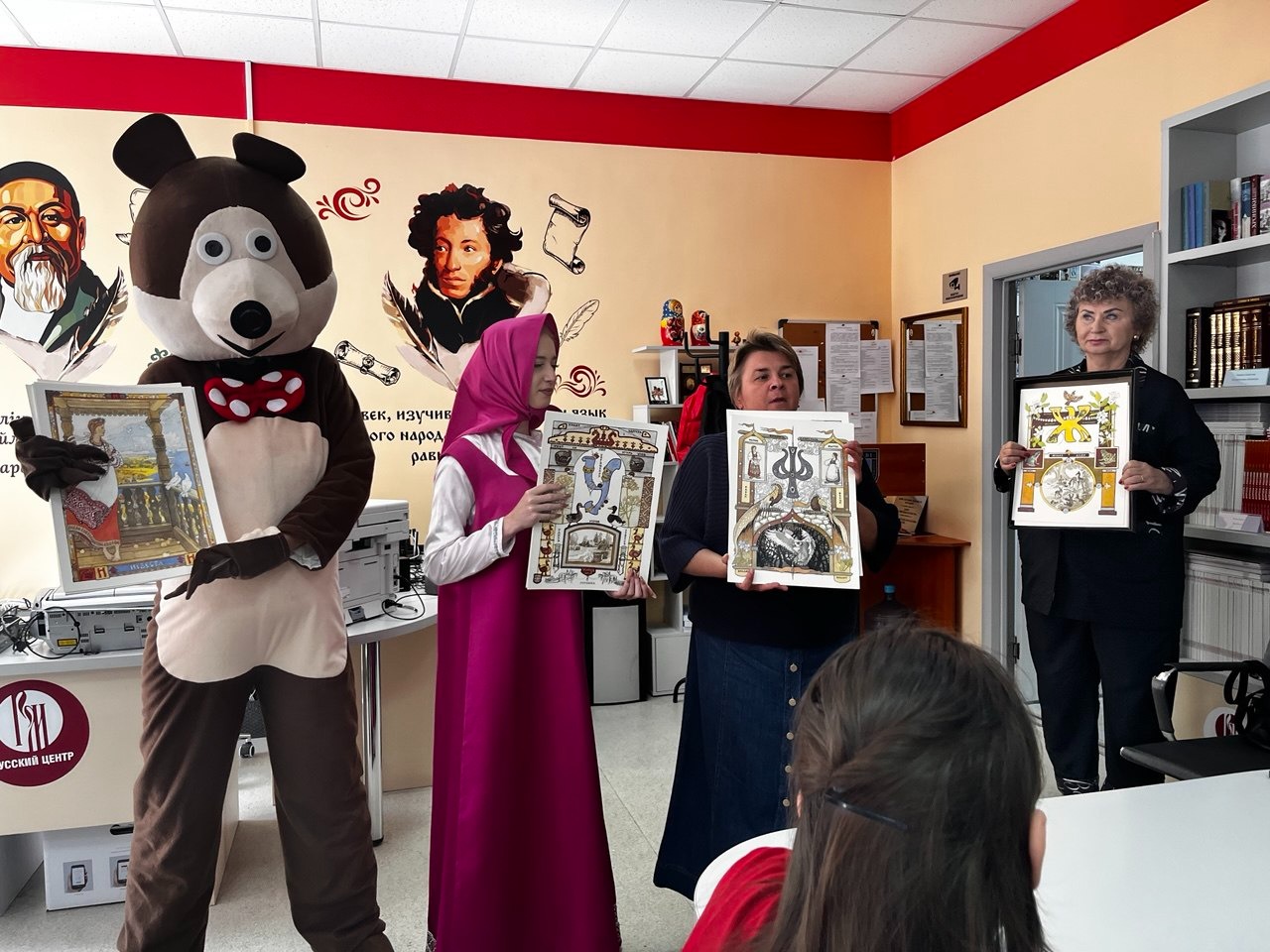 Вручение издания Азбуки Центру «Русский язык и культура» проходило в виде театрализованного представления с участием сказочных героев известного мультфильма «Маша и медведь».