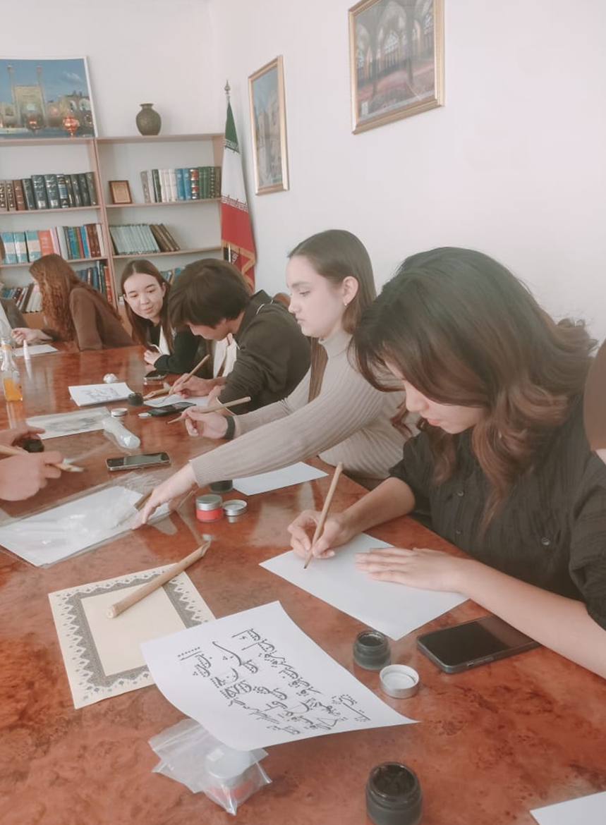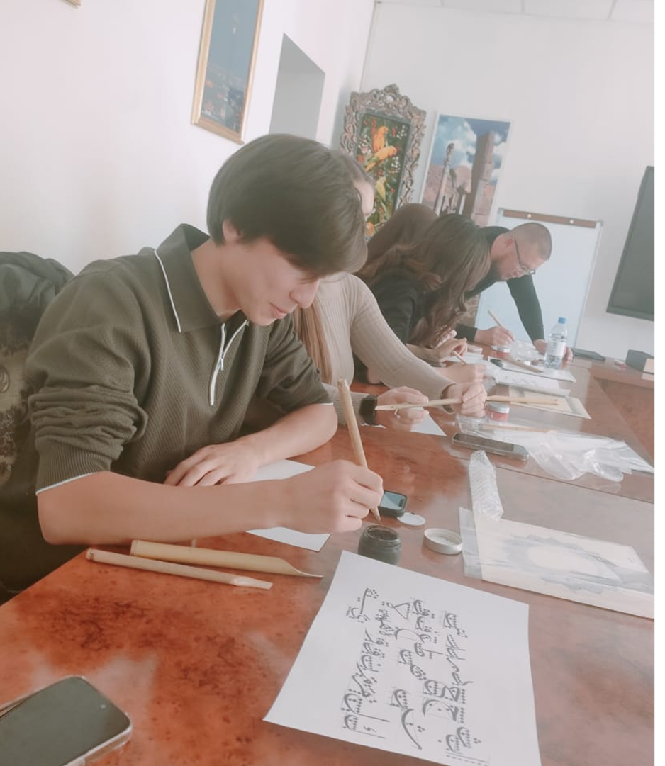 Шеберлік сабағына «Шығыстану» және «Аударма ісі» білім беру бағдарламаларының 1–3 курс студенттері қатысып, араб каллиграфиясын мәдениетаралық диалог пен шығармашылық өрнек ретінде таныды.