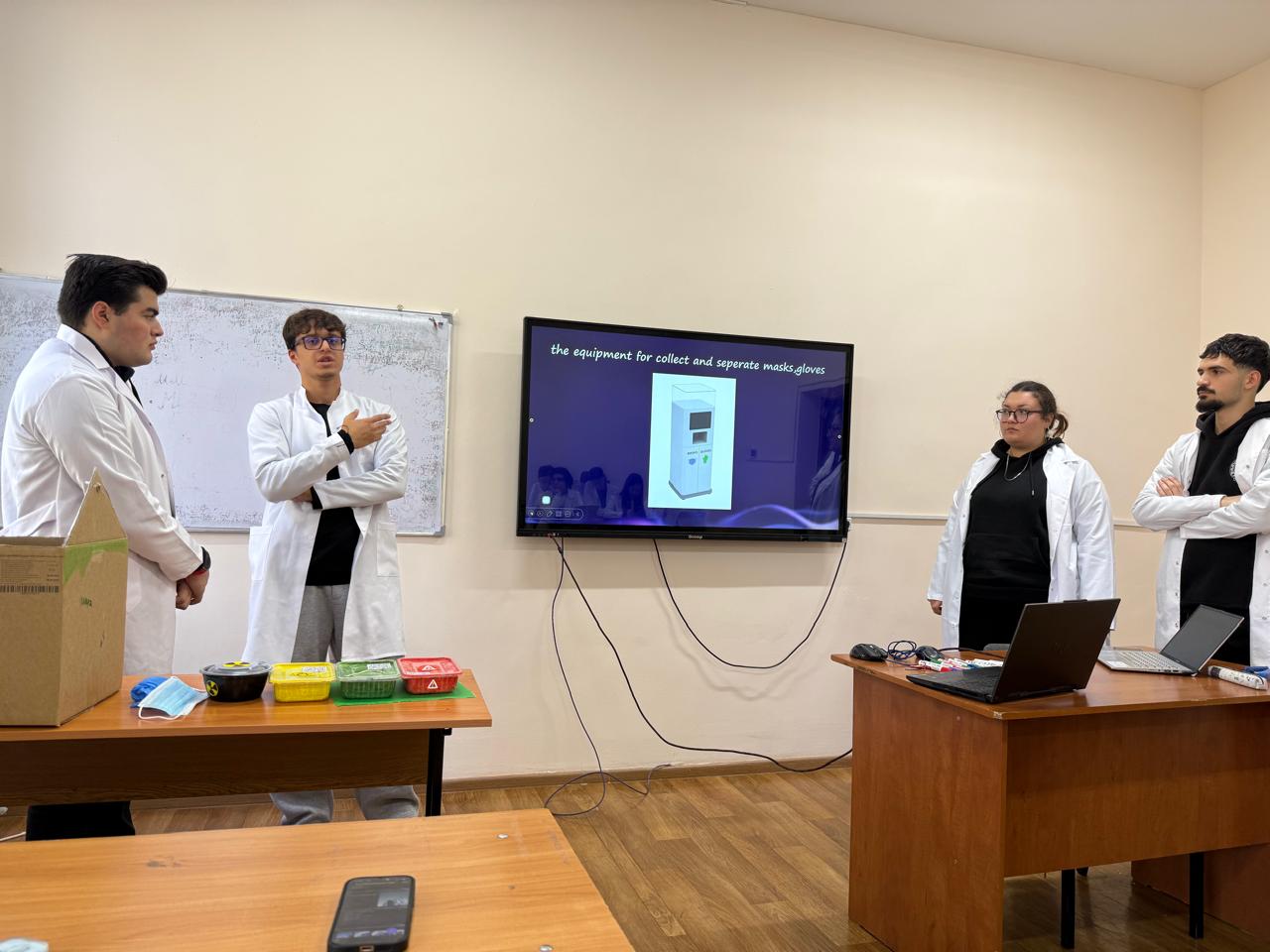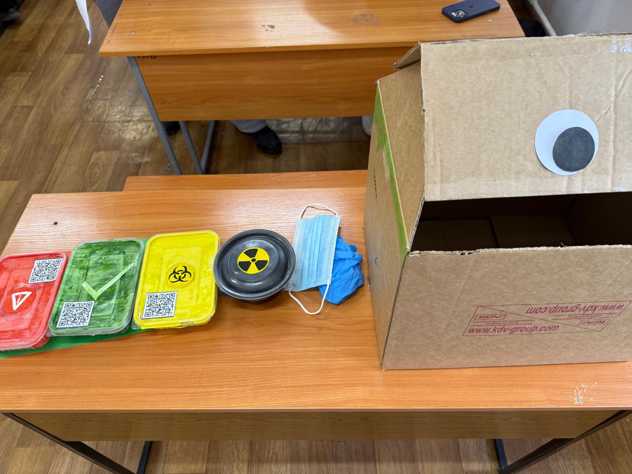 🔹 Студенттер өз қолдарымен жасалған арнайы контейнерді ұсынды. Ол контейнерге қолғаптар, бахилдер, шприцтер және т.б. медициналық қалдықтар жиналады.
