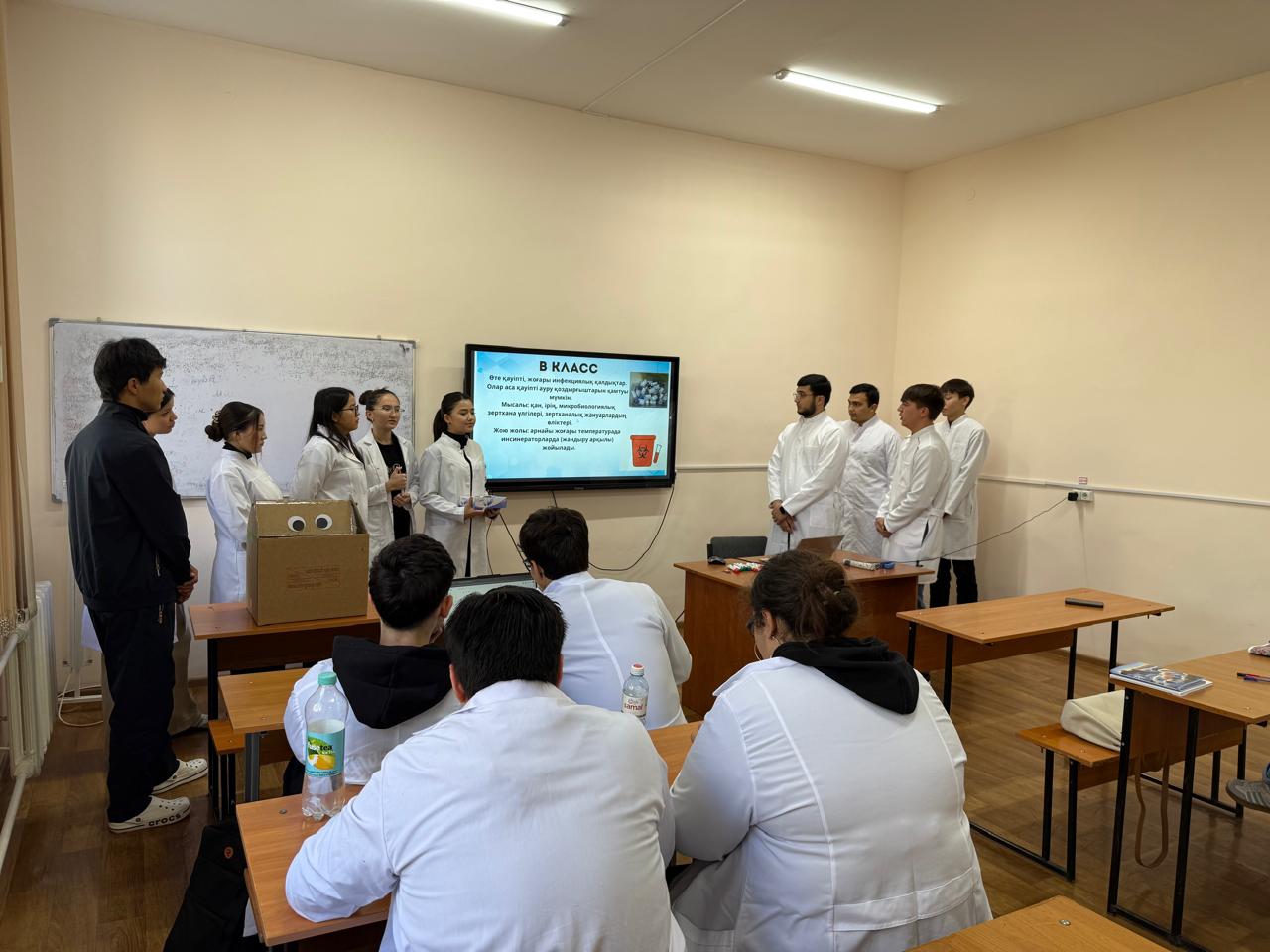 🔹 Іс-шара барысында студенттер медициналық қалдықтардың қауіптілік класына қарай жіктелуін таныстырып, оны көрнекі түрде көрсетті.