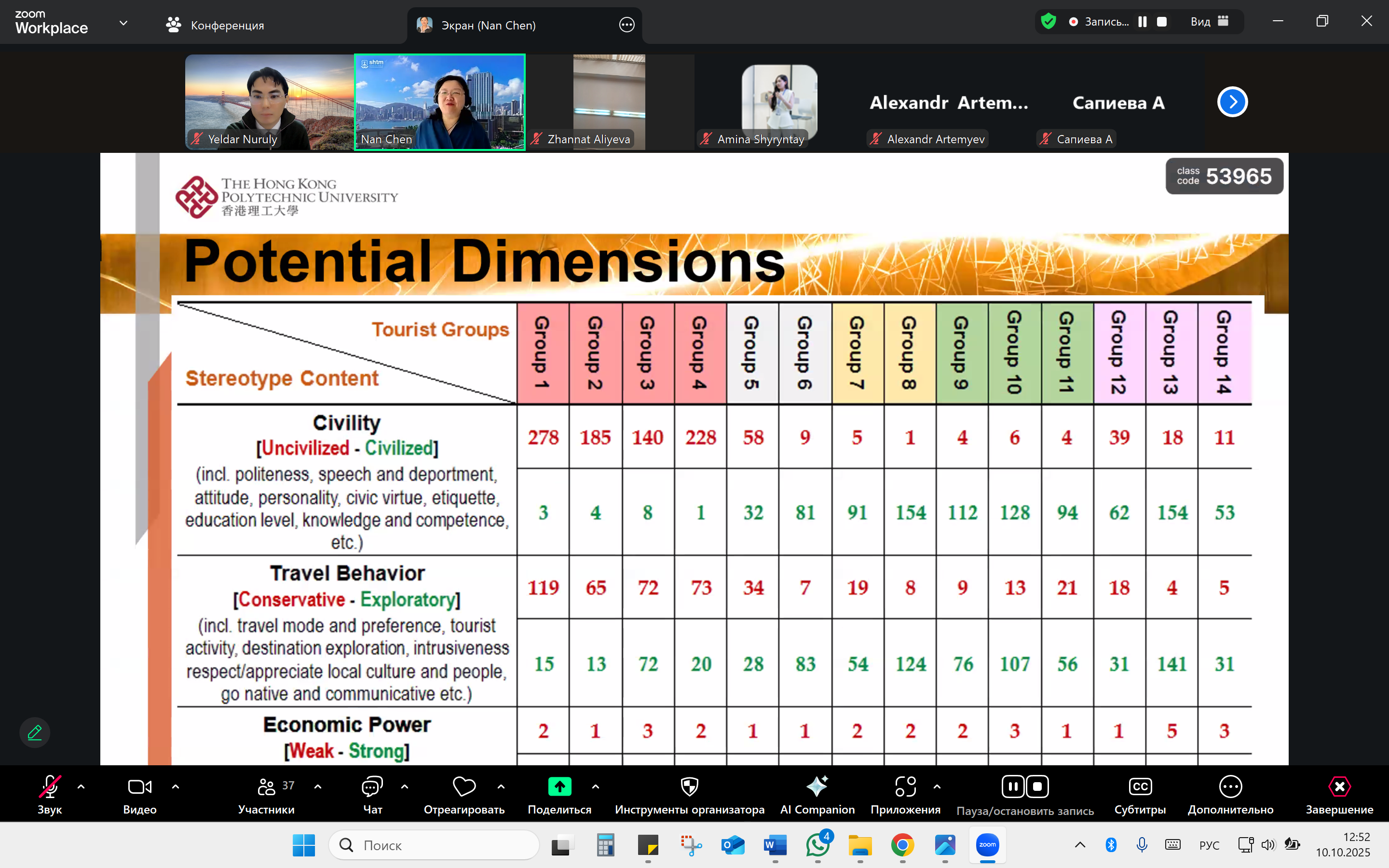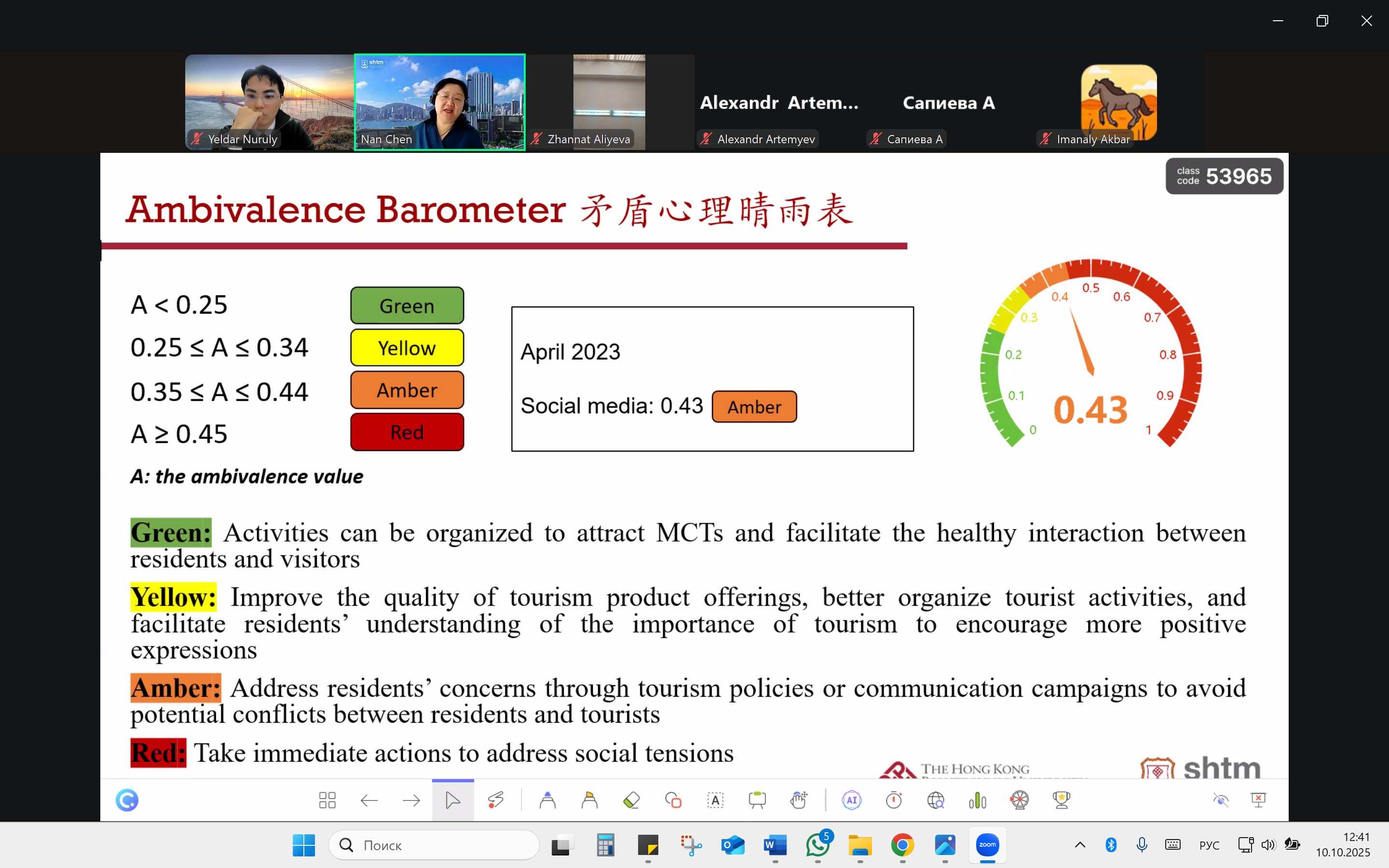Д-р Нан Чен өз баяндамасында овертуризм жағдайындағы әлеуметтік тұрақтылық мәселелерін жан-жақты талқылады. Ол жергілікті тұрғындардың туризмге деген көзқарасын, олардың эмоциялық реакциясын және туризмнің даму үдерісіне қатысу деңгейін зерттеу нәтижелерімен бөлісті. Ғалым Resident Sentiment Index, Ambivalence Barometer және TOUROMETER сияқты инновациялық құралдарды таныстырып, қоғамдағы туристік ахуалды талдаудың ғылыми тәсілдерін түсіндірді.