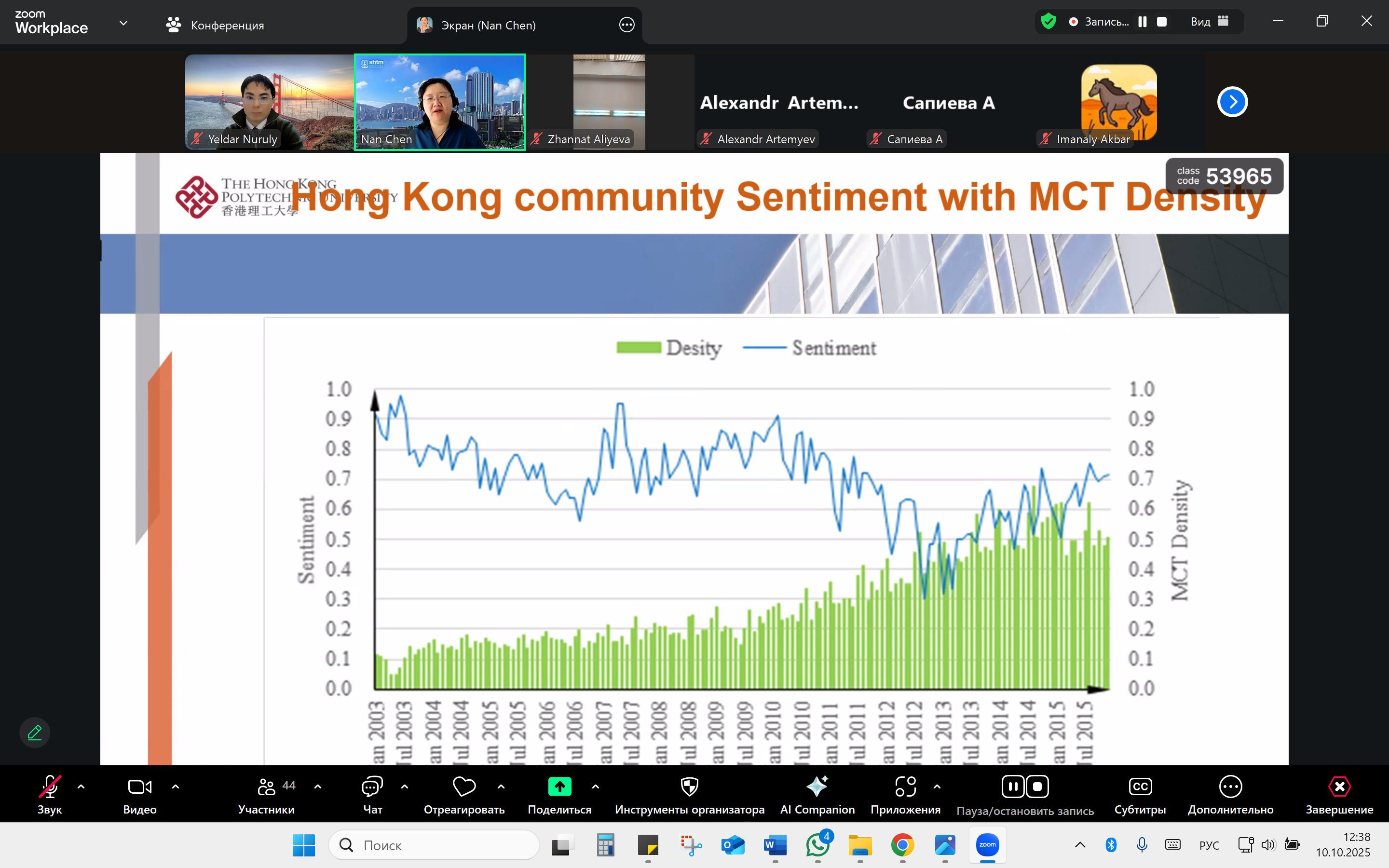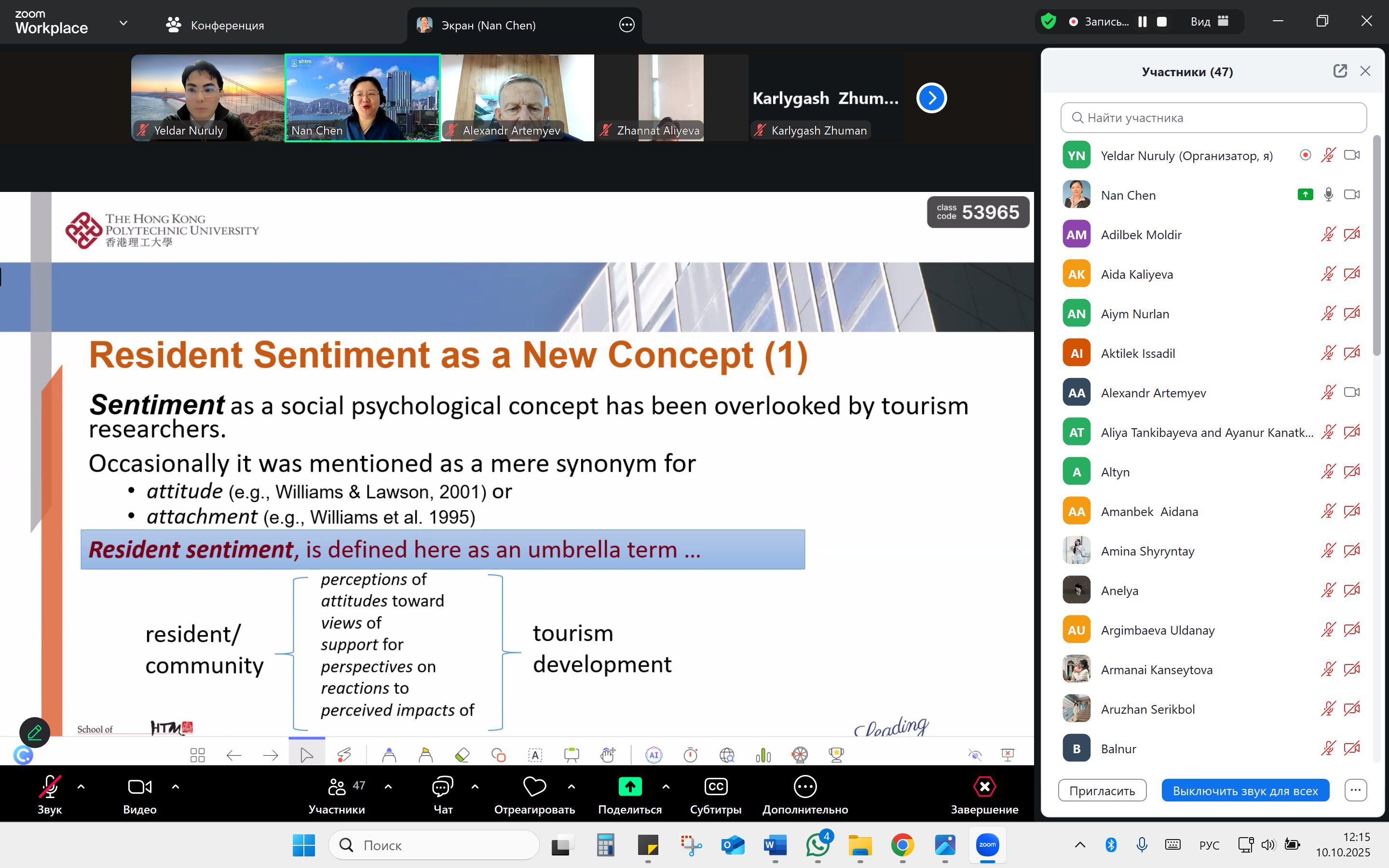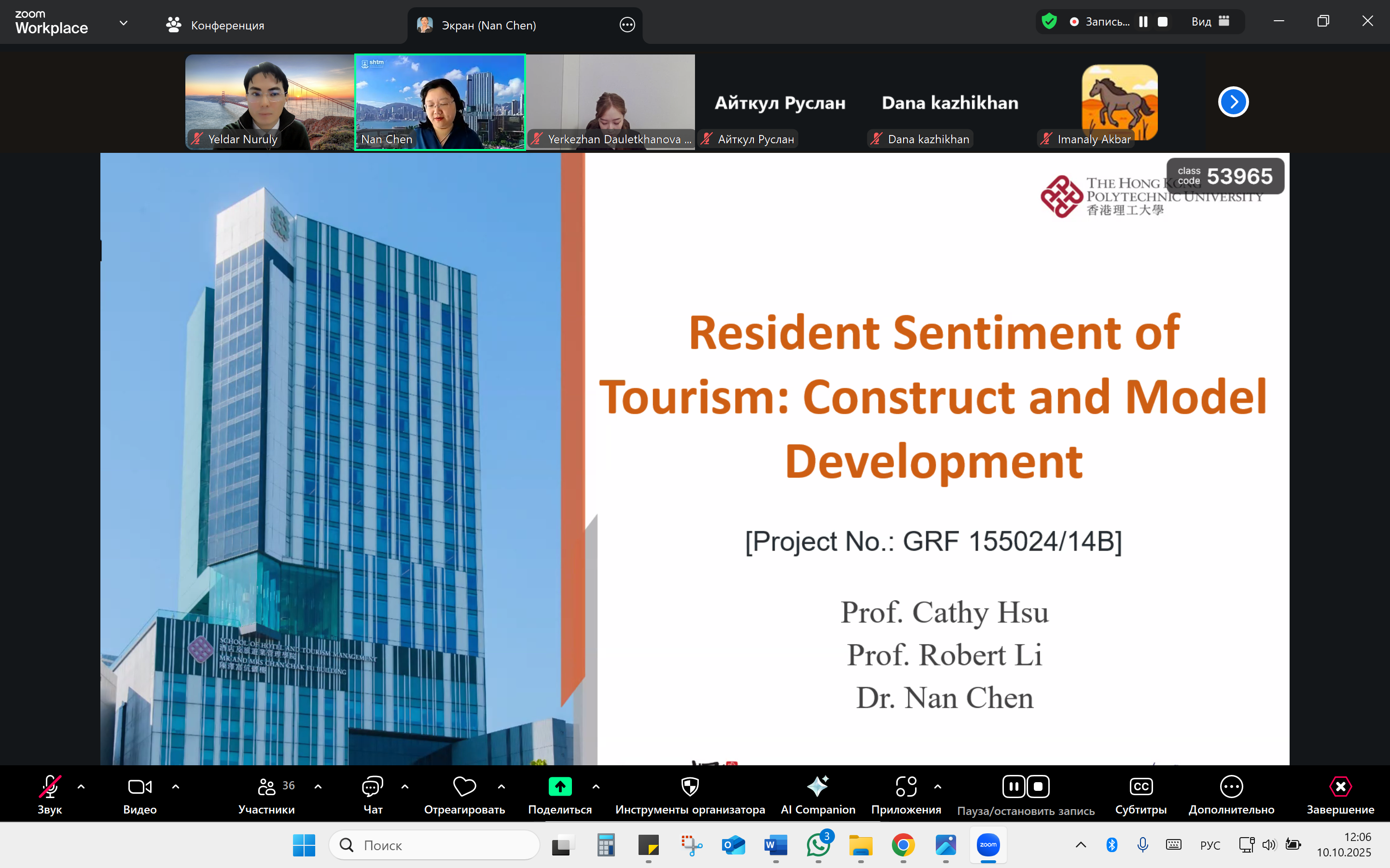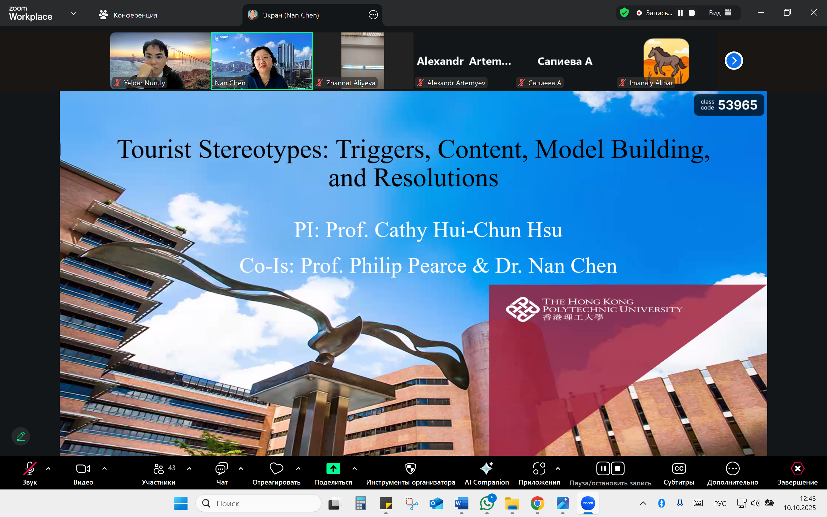 2025 жылғы 10 қазанда әл-Фараби атындағы ҚазҰУ-де PolyU–KazNU онлайн-дәрістер сериясының екінші сабағы өтті. Бұл дәрісті Гонконг Политехникалық университетінің (PolyU) Қонақ үй және туризм менеджменті мектебінің доценті д-р Нан Чен оқыды. Дәріс тақырыбы – «Social Sustainability in Over-tourism Destinations» (Овертуризм жағдайындағы дестинациялардың әлеуметтік тұрақтылығы).