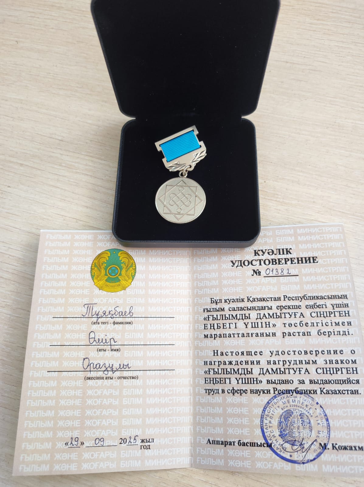 PhD Тұяқбаев Өмір Оразұлы – ғылым саласына қосқан еңбегі үшін марапатталды