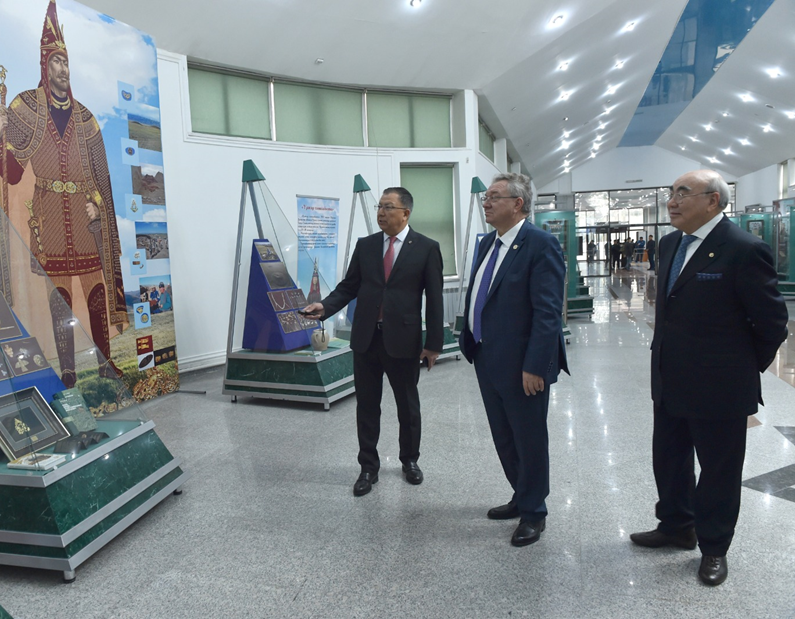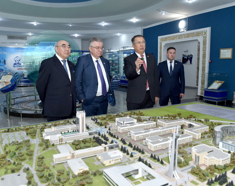 После официальной встречи почетные гости в сопровождении ректора КазНУ им. аль-Фараби Ж.К.Туймебаева прошли по музею, где ознакомились с экспозициями музея и генеральным планом развития университета