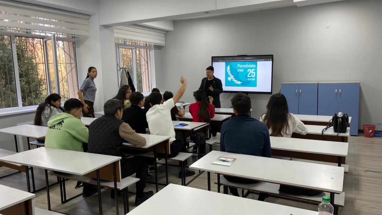 Сабақ барысында студенттер Республика күнінің тарихи маңызын, тәуелсіздіктің қалыптасу кезеңдерін және еліміздің әлеуметтік-экономикалық, экологиялық салалардағы жетістіктерін талқылады. Ерекше назар жас ұрпақтың мемлекеттілікті нығайтудағы және ұлттық құндылықтарды сақтаудағы рөліне аударылды. Ашық пікір алмасу мен белсенді қатысу атмосферасы студенттердің патриоттық көзқарасын қалыптастыруға және ел болашағы үшін жеке жауапкершілігін сезінуге ықпал етті.